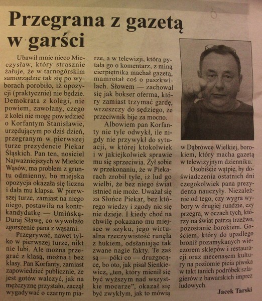 długo nie trzeba było czekać. zaraz po zainkasowaniu podobno 1300zł (a może więcej)od Satostwa za wykupioną całą stronę w GWARKU- redaktor naczelny -Jacek Tarski już w drugim numerze pod rząd obsmarowuje największego oponenta Starosty