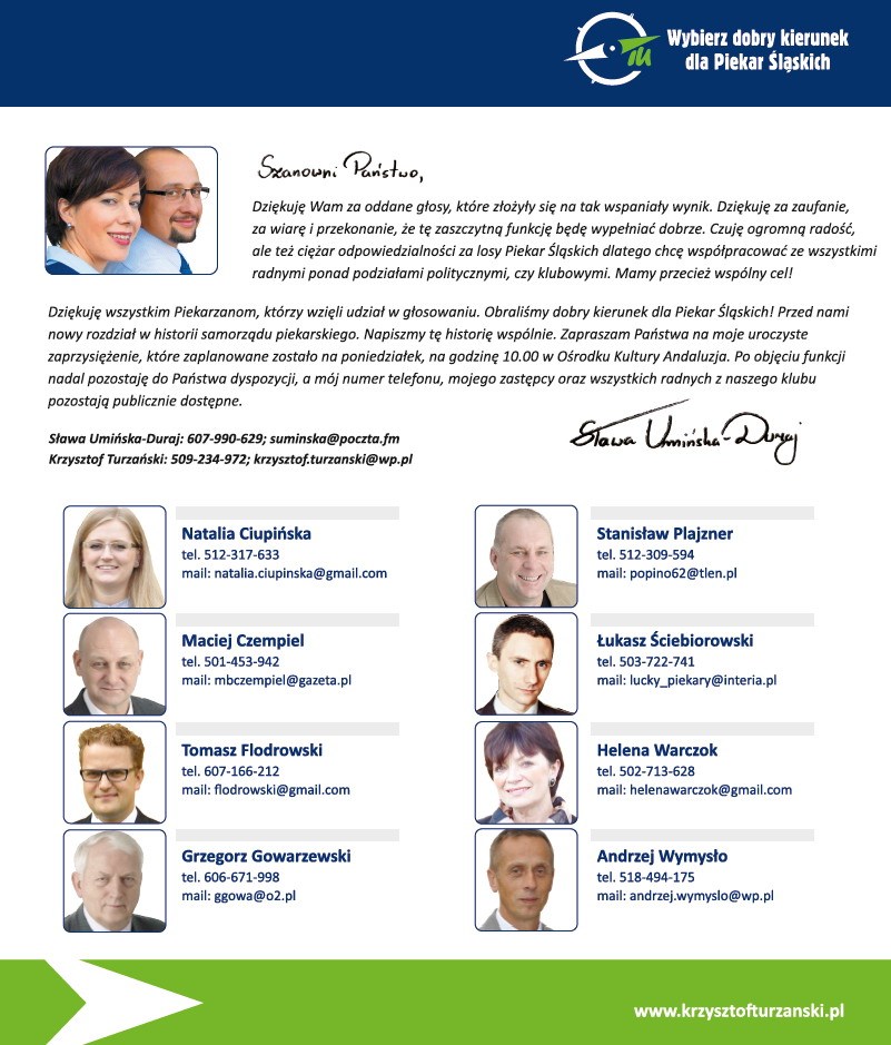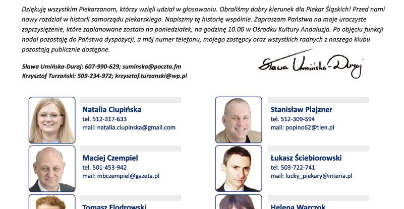 A z kim z Naszych Piekar się Pan kontaktował? Ja z Panem Krauza i nie było nigdy problemu. Od razu dodam, że mieszkam w Dw i cieszę się, że radni TU podali swoje namiary. Pozdrawiam