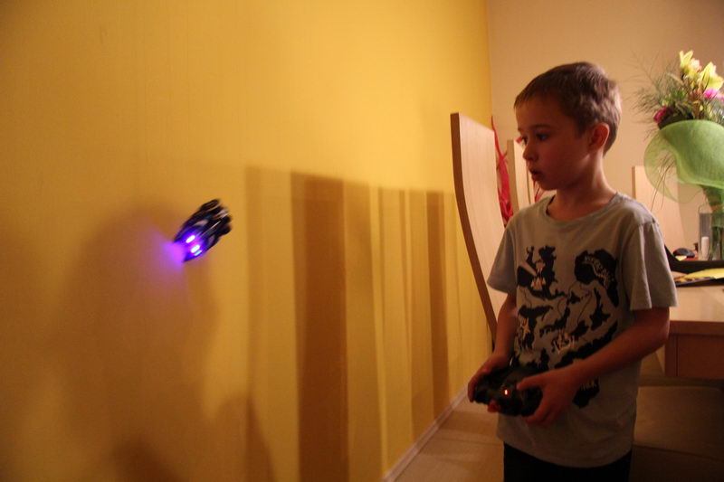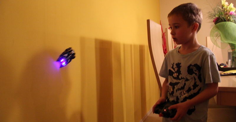 To taki prezent przedświąteczny… Trafił się przez przypadek, ale trudno było się powstrzymać przed zakupem, bo na pudełku napisali, że samochodzik jeździ po ścianach, a nawet po… suficie. Z pewną dozą niepewności umieściłem pojazd koło lampy. Nie spadł! Fantastyczna zabawka. Polecam.