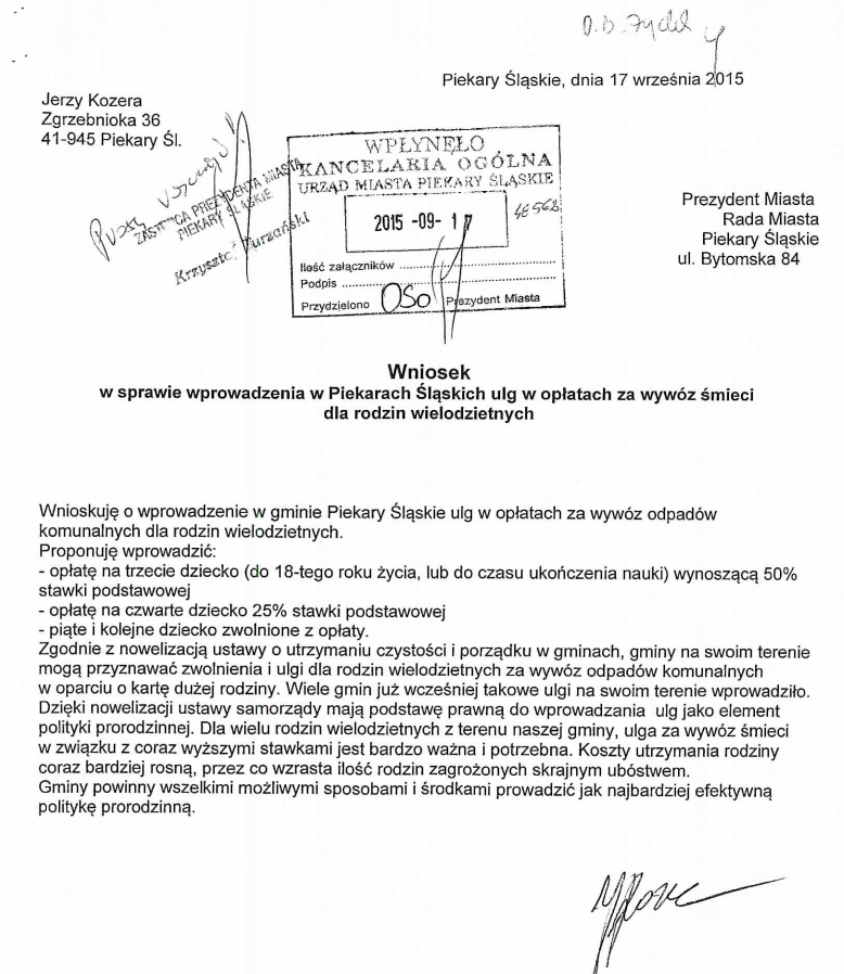Szykuje nam się wszystkim podwyżka za wywóz śmieci więc dla rodzin wielodzietnych będzie to realny wzrost kosztów . Zastanawiam się tylko kto będzie te ulgi finansował my wszyscy mieszkańcy Piekar Śląskich bo koszt wywozu śmieci będzie rozłożony na mniejszą liczbę mieszkańców a więc będzie powód do następnych podwyżek czy będzie to rozwiązane przez dotację miasta czyli miasto uzupełni kwotę ulgi udzieloną rodziną wielodzietnym . Jeżeli było by to rozwiązanie drugie to jestem za