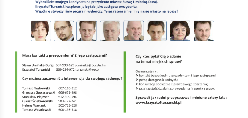 To jest program wyborczy z kampanii wyborczej z aktualnym wtedy składem radnych kadencji 2010-2014. Wygląd oryginalnego programu wyborczego – stąd osoby, które już dziś radnymi nie są i brakuje osób, które radnymi zostały…