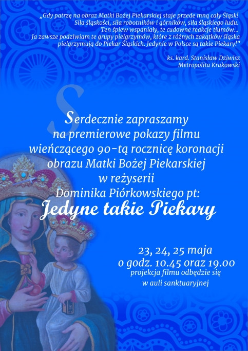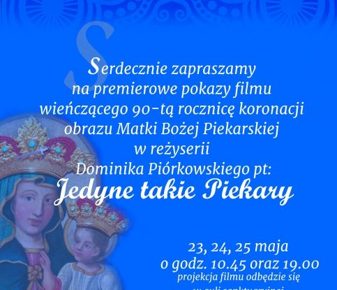 Premiera filmu w reżyserii Dominika Piórkowskiego “Jedyne takie Piekary”, który wieńczy 90. rocznicę koronacji obrazu Matki Bożej odbędzie się w najbliższą niedzielę. Film pokazuje fenomen Piekar Śląskich, przybliża historię miasta i skupia uwagę na kulcie Matki Bożej Piekarskiej. W scenariuszu znalazły się inne miejsca związane z kultem Matki Bożej Piekarskiej: Kraków, Praga czy Opole. Premiera filmu ma charakter zamknięty, natomiast 23, 24 i 25 maja o godz. 10.45 i 19.00 odbędą się projekcje otwarte w auli sanktuaryjnej.