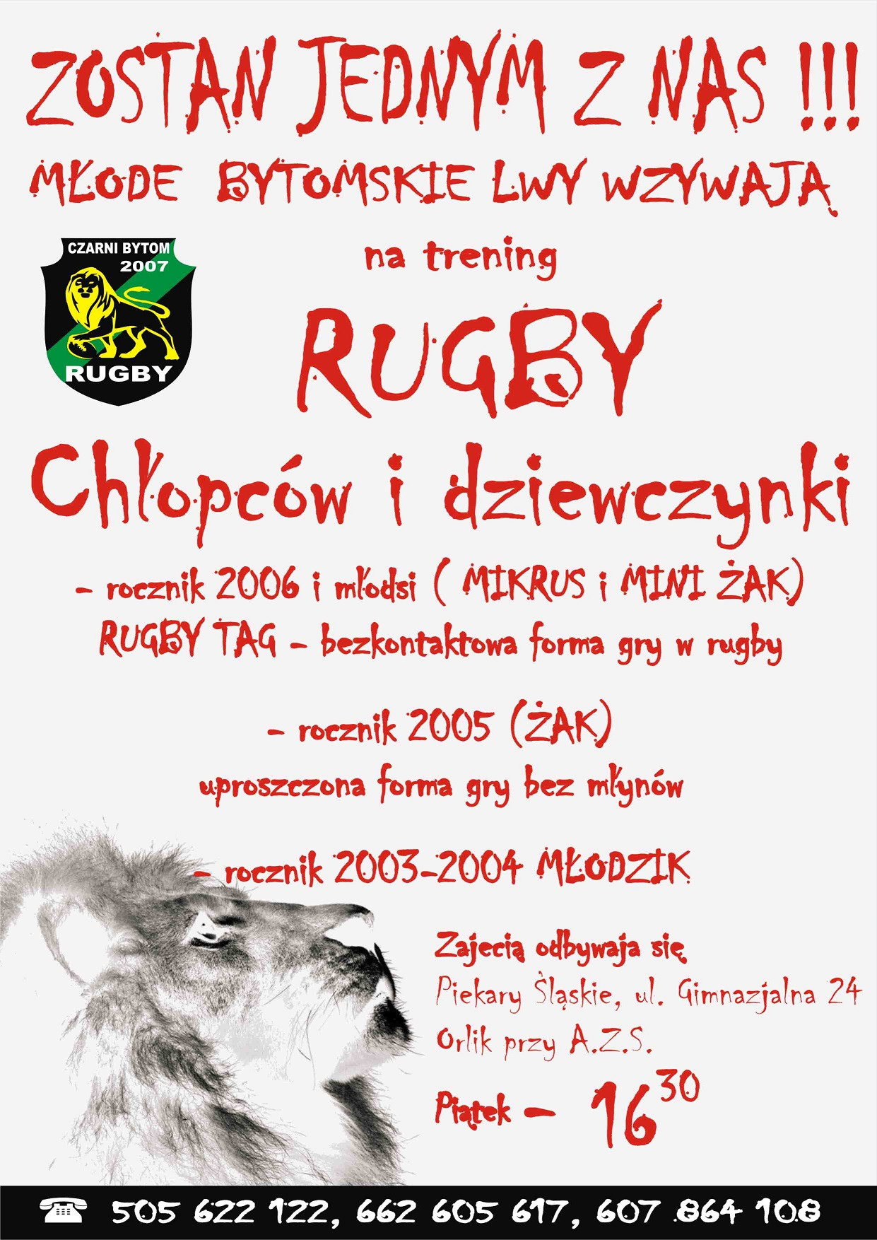 Nie jest to sport najpopularniejszy, ale z pewnością emocjonujący. Miłośnicy rugby postanowili sprowadzić tę dyscyplinę do Piekar Śląskich. Zaczęło się od warsztatów dla klasy sportowo-turystycznej w AZS, ale szybko pomysł się rozrósł i dziś są już zajęcia dla dzieci i młodzieży na orliku przy AZS. Chętnych nie brakuje. Zajęcia są w piątki, o 16:30, niezależnie od pogody, i są darmowe.