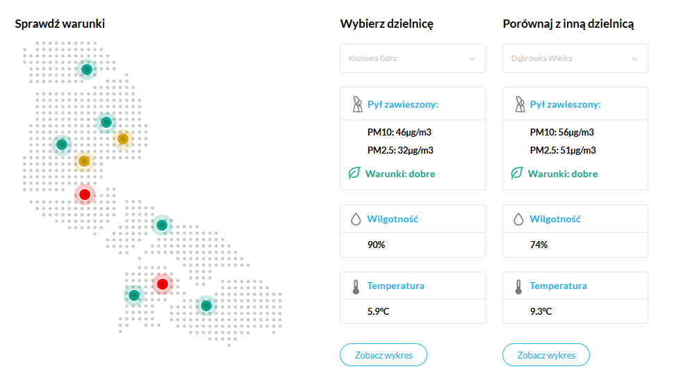 Aktualnie pracujemy nad zmianą sposobu prezentacji danych na wykresach wraz ze zwiększeniem ilości dostępnych opcji, skala poziomu zanieczyszczeń zostanie dostosowana do polskiej, sześciostopniowej skali.