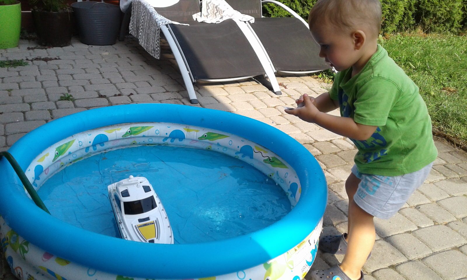 Jedna z fantastycznych zabawek to zdalnie sterowana łódka. Prezent dla solenizanta, jego brata i taty. Ciekawe, kto się bardziej cieszy…