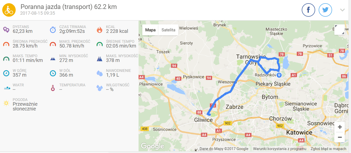 Nie wiem skąd mi się biorą takie pomysły, ale dziś postanowiłem połączyć rower i bieganie. Plan: 60 km na rowerze i 10 km biegiem. Ruszyłem jak wicher i po godzinie, ze średnią ponad 32,5 km na godzinę zameldowałem się w Gliwicach. Po drodze policjanci złapali mnie na radar – 37 km krzyknął mi funkcjonariusz kiedy przejeżdżałem. Na tym odcinku niewiele brakowało do mandatu. Ale wracając do Piekar było już z kilometra na kilometr wolniej.