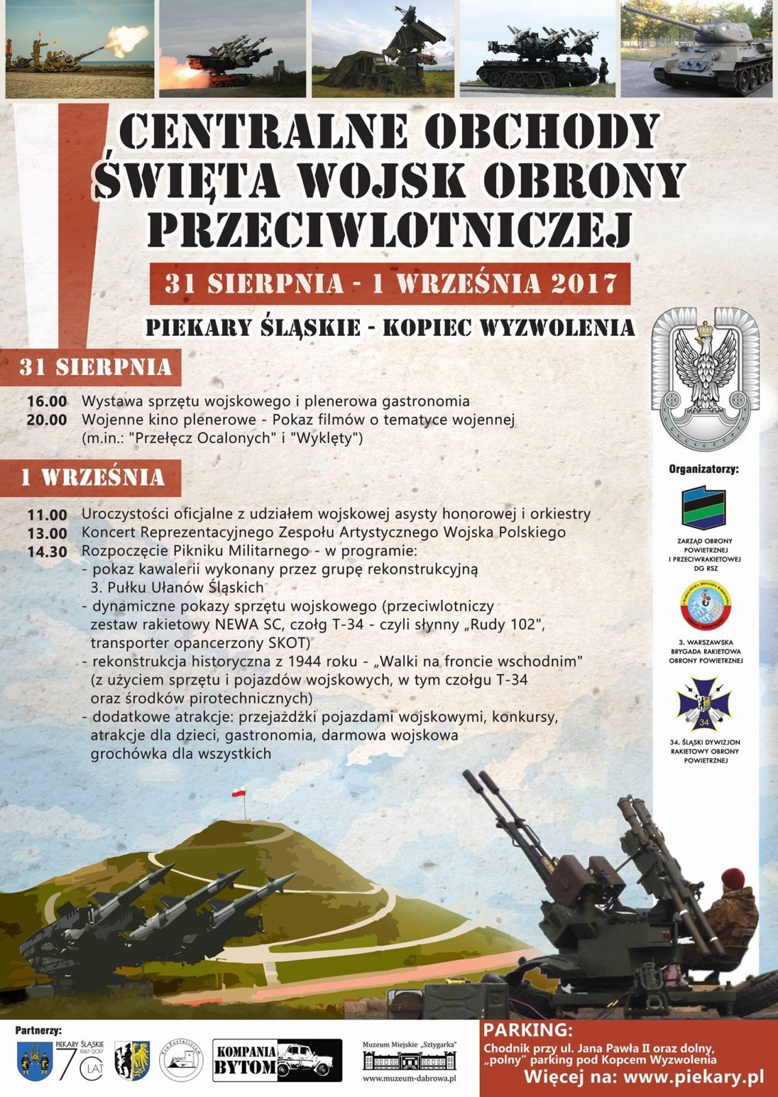 W tym roku Święto Wojsk Obrony Przeciwlotniczej wypada 1 września. W Piekarach Śląskich sprzęt wojskowy rozstawiony zostanie już 31 sierpnia, na dzień przed oficjalnymi uroczystościami. Tego samego dnia od godziny 20.00 na terenie Kopca Wyzwolenia emitowane będą również filmy o tematyce wojennej (m.in.: „Przełęcz Ocalałych” i „Wyklęty”) w ramach przygotowanego specjalnie na tę okazję kina plenerowego.