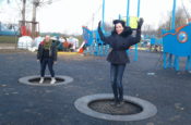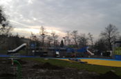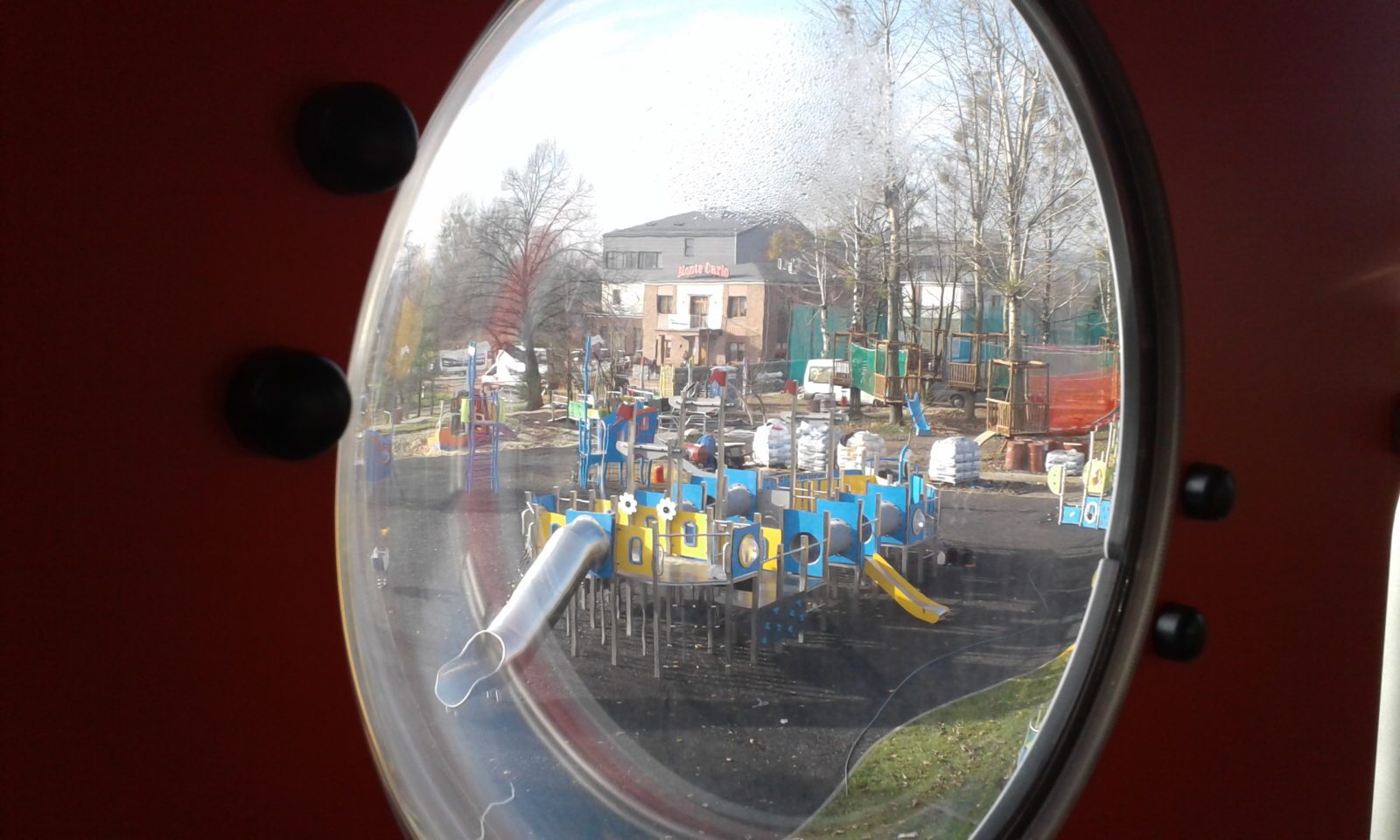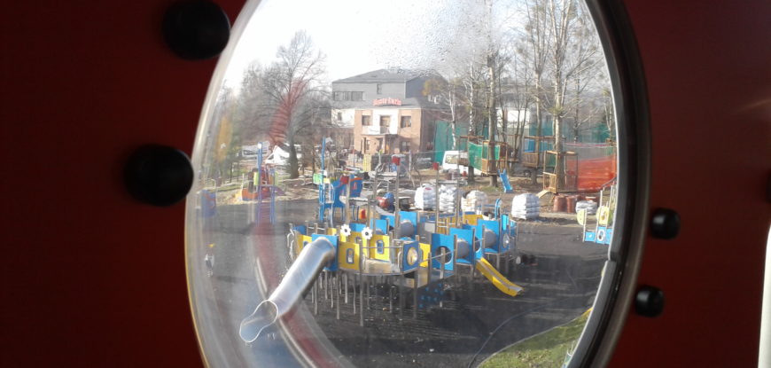 Chyba już wszystkie urządzenia zostały zainstalowane. Pojawił się dodatkowo “mini park linowy”, powstają kolorowe nawierzchnie. Zwróćcie uwagę na kolorystykę poliuretanu. Żółty piasek, błękitne płycizny i ciemno niebieska – głęboka woda, po której można bezpiecznie żeglować. Całość będzie robić świetne wrażenie.