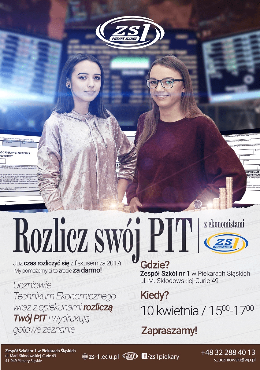 Uczniowie klasy III Technikum Ekonomicznego, którzy obecnie przebywają na czterotygodniowej praktyce w Urzędzie Skarbowym, pomogą mieszkańcom wypełnić rozliczenia podatkowe za rok 2017. Akcja “Rozlicz swój PIT z ekonomistami” odbędzie się już 10 kwietnia w budynku ZS1.