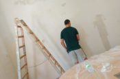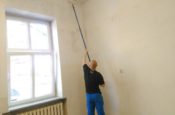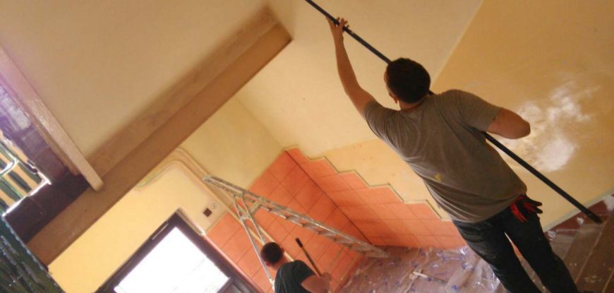 Kolejny dzień – kolejne wyzwania godzina 09:30 stawiamy się na miejscu i tym razem przeciwnik już nie taki łatwy, pokój Nauczycielski i korytarze, więc zarówno zakres jak i nie raz cyrkowe zdolności są potrzebne do wykonania pracy. Mobilizuje to nas jeszcze bardziej. Pierwszy na listę pokonanych wpisuje się pokój Nauczycielski i mały korytarz (wspomnienia ile razy zbieraliśmy upomnienia za bajtla biegając jak szaleni po drewnianych schodach cały czas towarzyszyły nam podczas jego remontu).