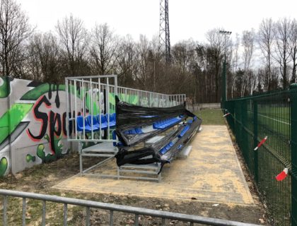 Mała rzecz, a cieszy. Niewielka trybunka dla kibiców, rodziców i ciekawskich stanęła przy boisku ze szt...