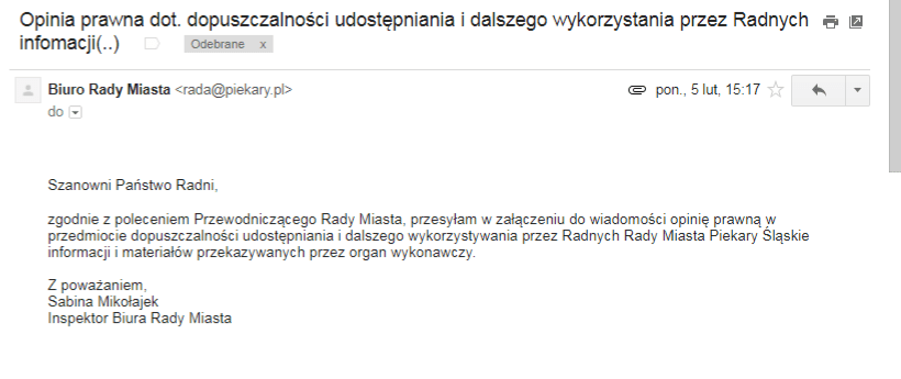 Już coś tam Państwu radnym świta? Dokument kierowany do Prezydenta Miasta jest jawny i KAŻDY ma do niego dostęp w ramach ustawy o dostępie do informacji publicznej, co więcej złożył go radny, a zatem również osoba publiczna. Jeszcze weselej – oficjalna “korespondencja” jest zamieszczana w BIP (Biuletynie Informacji Publicznej), z którego można pobrać i rozpowszechniać dokumenty w dowolnej formie.