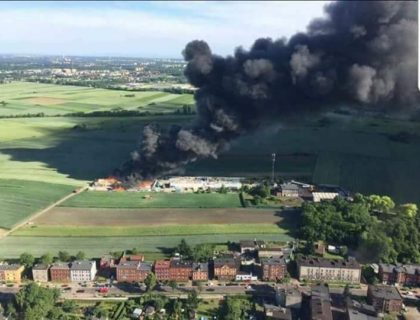 Potężny pożar na składowisku makulatury w Piekarach Śląskich. Ogniem zajęte są materiały składowane w ...