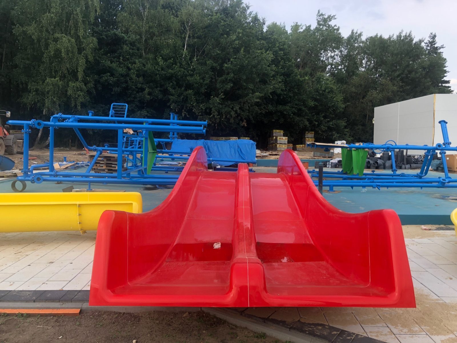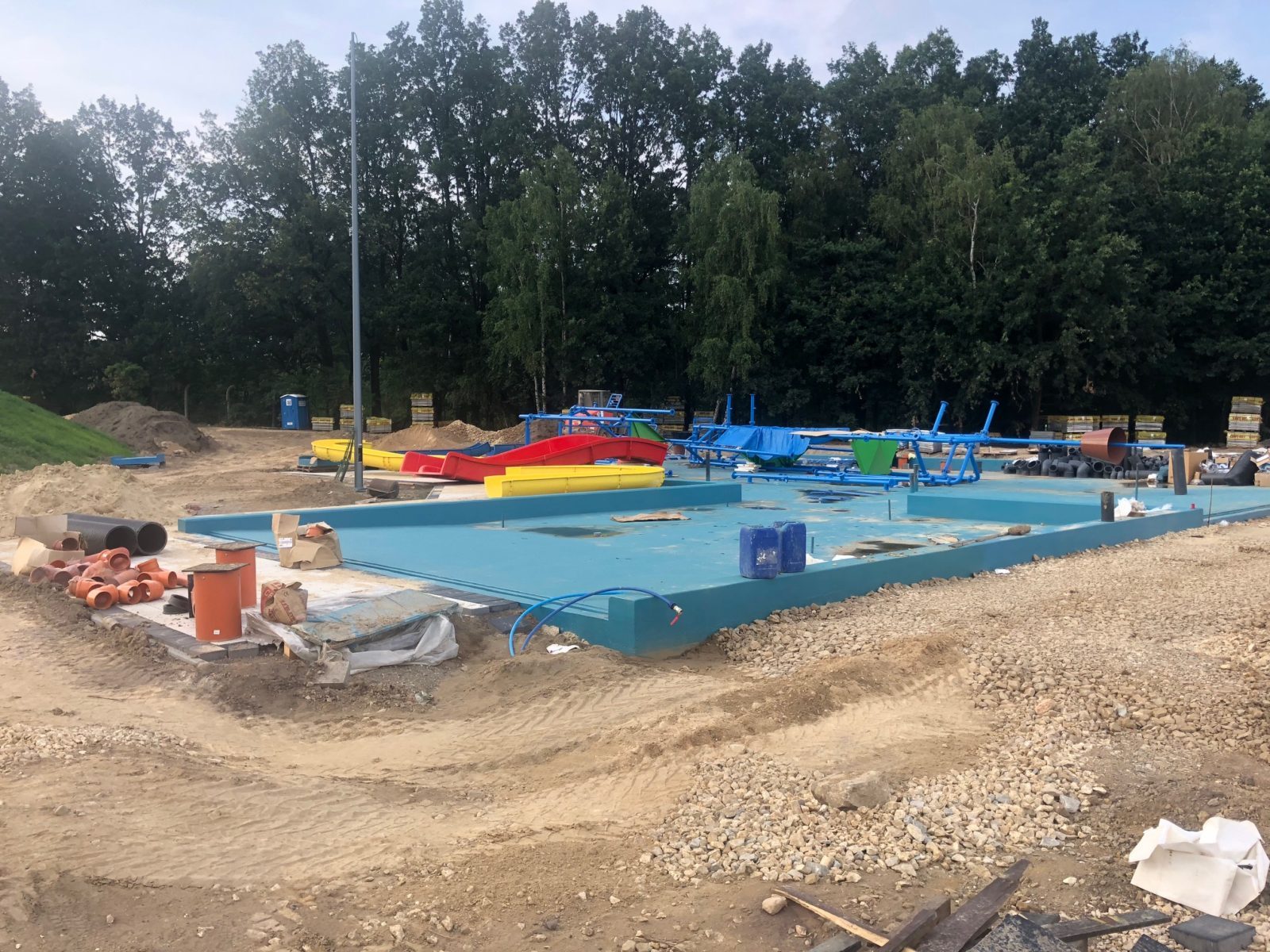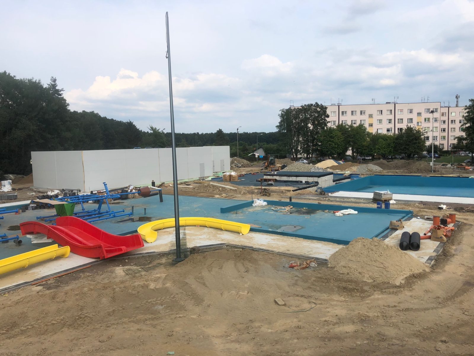 Przyjechały urządzenia na wodny plac zabaw – ależ to będzie spory obiekt. Zobaczcie zdjęcia! Teoretycznie w ciągu dwóch tygodni w basenie już powinna pojawić się woda. Jeśli nie wydarzy się nic niespodziewanego otwarcie w sierpniu.