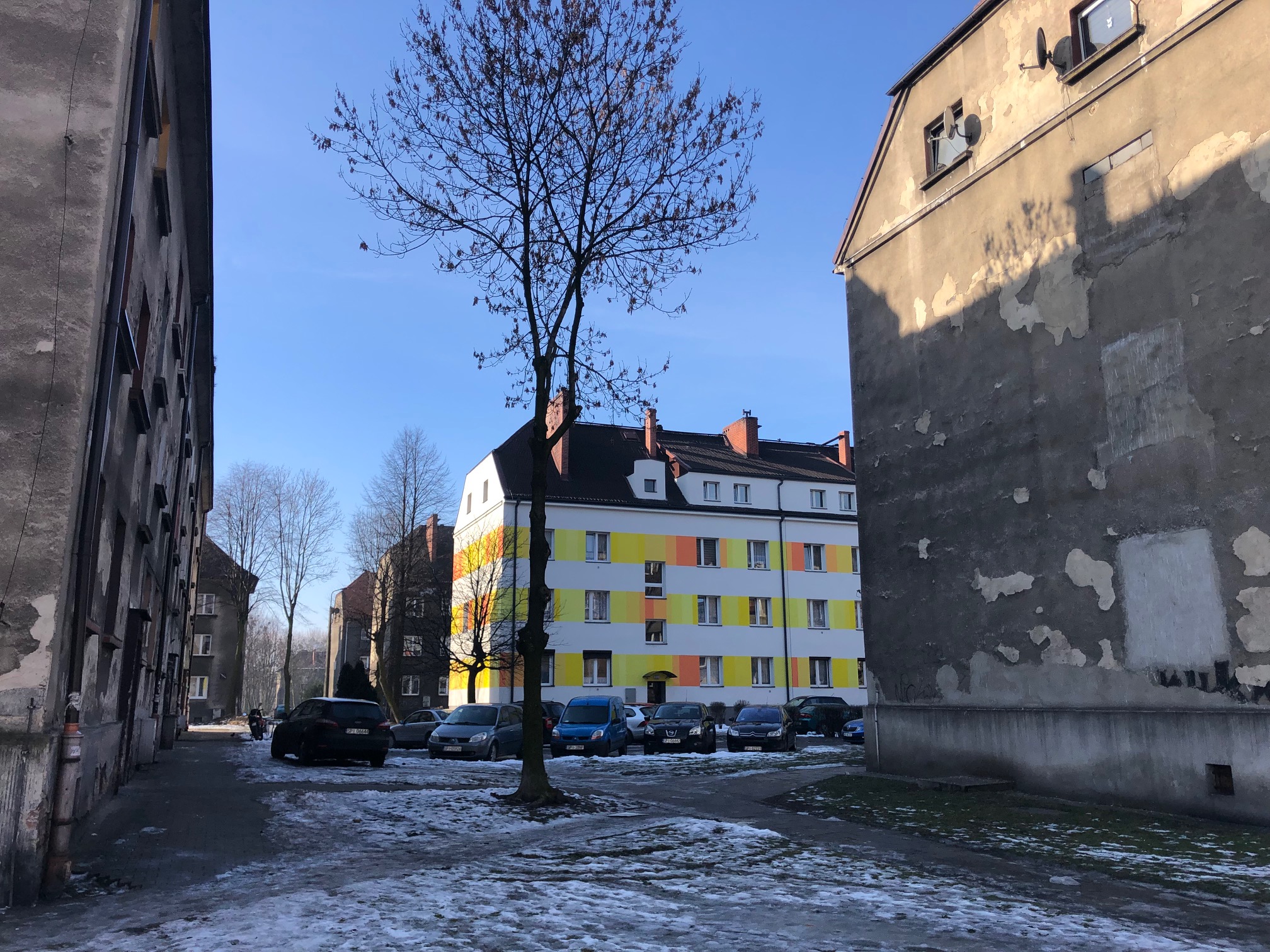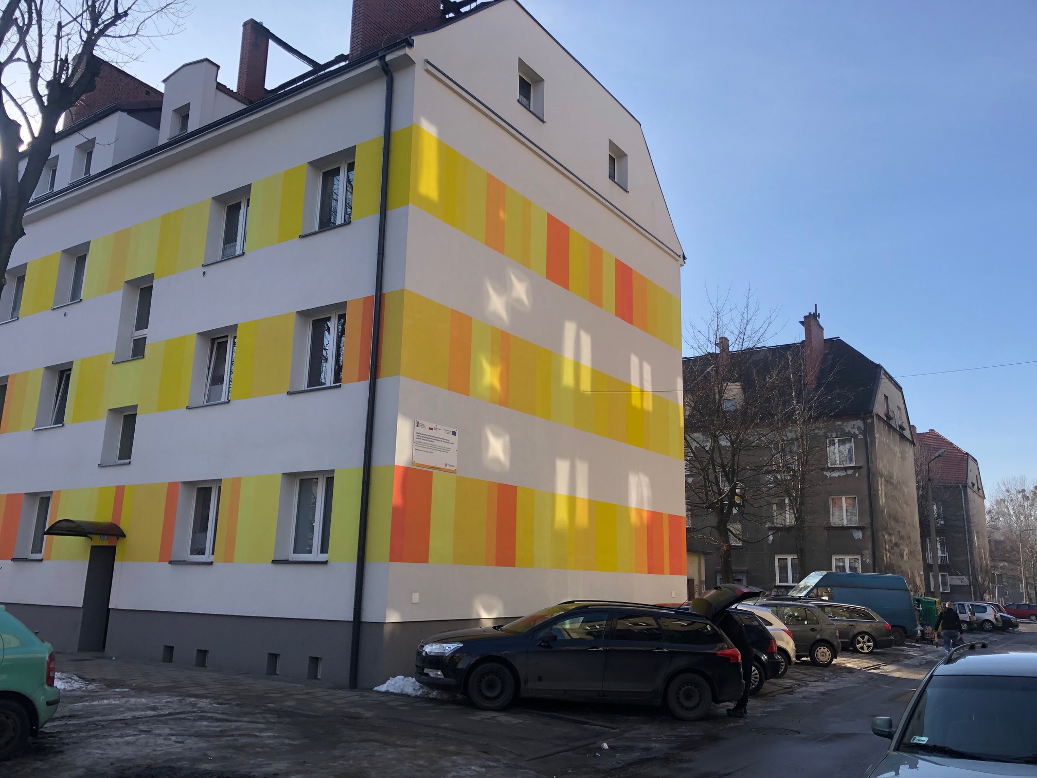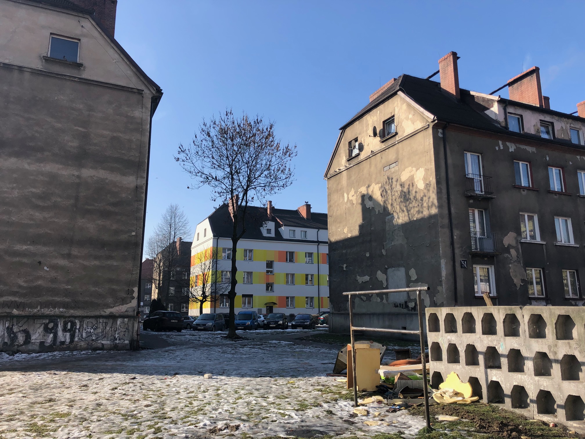Ja chyba nie bardzo się znam na charakterach, historii i klimacie, bo mój ocieplony, kolorowy budynek podoba mi się znacznie bardziej. Aż gęba się śmieje na jego widok. Taki powiew optymizmu w tym szarym, ponurym i brudnym miejscu. Nie mieszkamy w skansenie! Czekamy na efekt końcowy.
