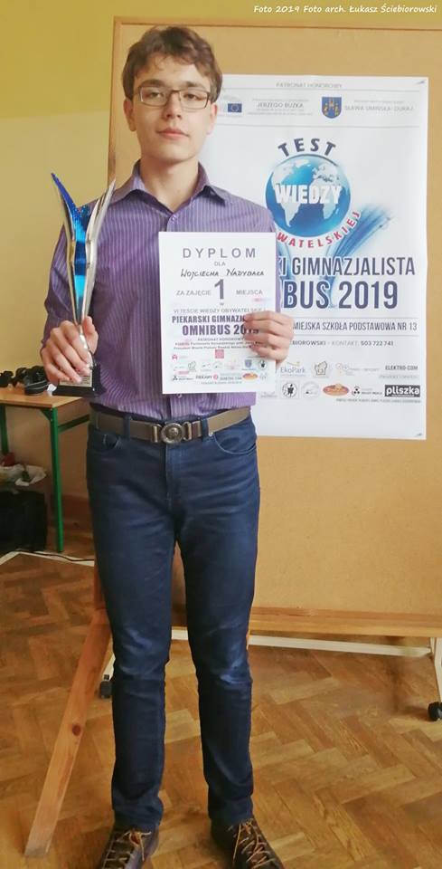 Pierwsze miejsce i tytuł Piekarskiego Gimnazjalisty Omnibusa wywalczył Wojciech Nadybał reprezentujący Miejskie Gimnazjum nr 3 w Akademickim Zespole Szkół, który najlepiej odpowiedziała na 55 pytań Testu. Dołączył do ekskluzywnego grona Omnibusów. Tytuł Piekarskiego Gimnazjalisty Omnibusa od roku 2014, czyli pierwszej edycji wywalczyli kolejno: Karol Krawczyk, Mateusz Wołowczyk, Aleksandra Żydek, Małgorzata Kopydłowska oraz Weronika Bochenek.