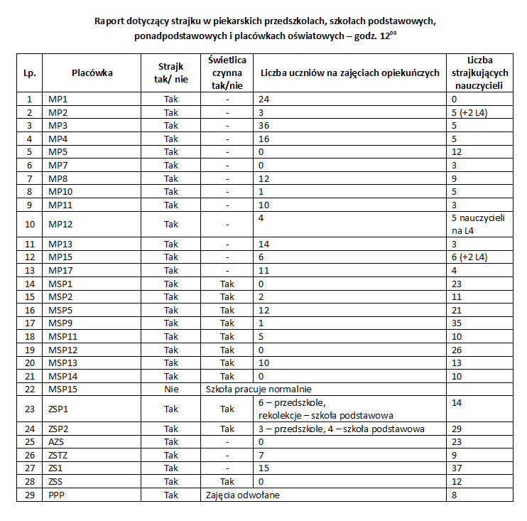 Panie Krzysztofie, dane z MSP 13 na godzinę 12.00 są nieprawdziwe. Strajkowało 21 nauczycieli. Nie wiem skąd pomyłka, ale można zobaczyć listę strajkujących. Pozdrawiam