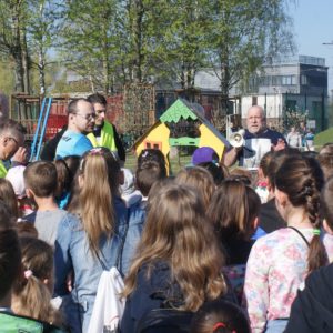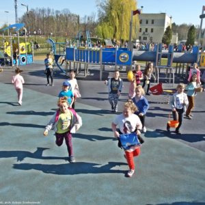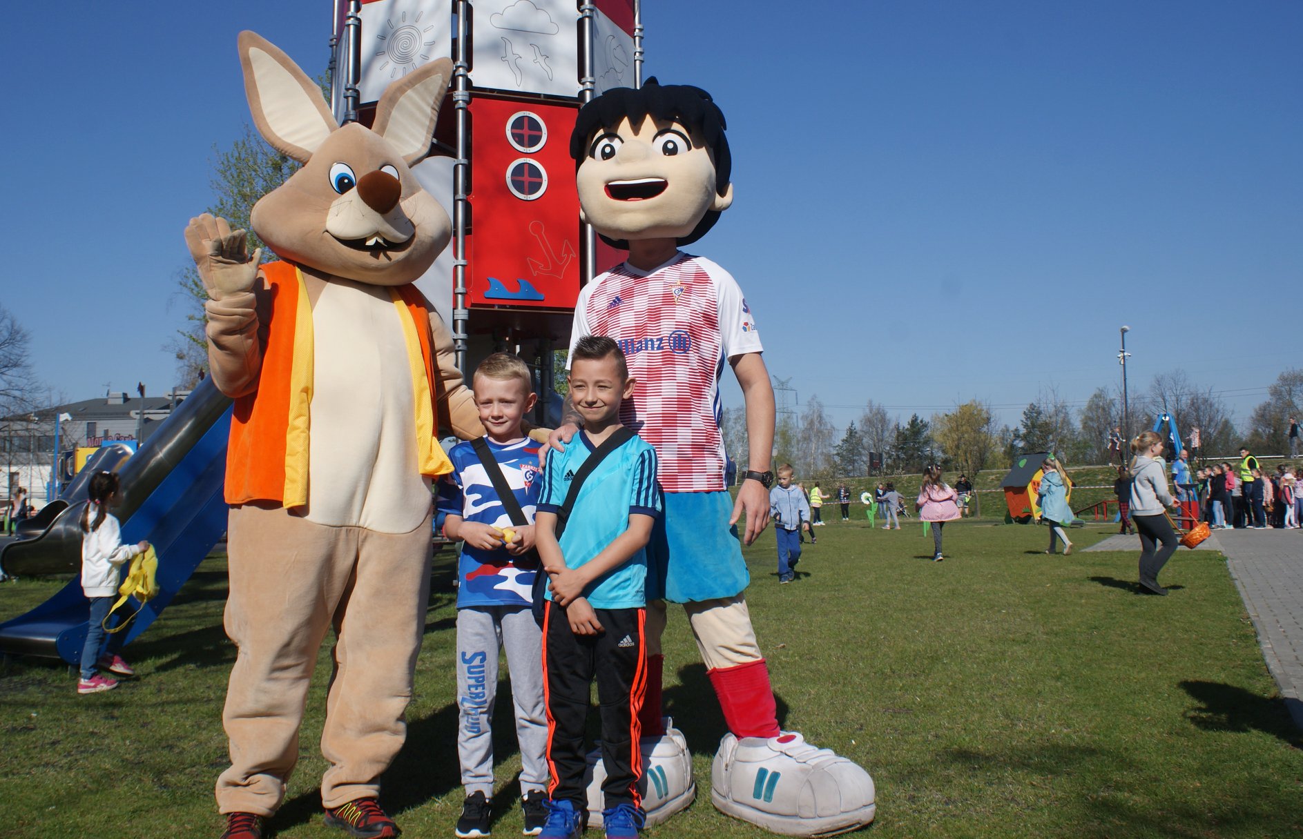 Dodatkową niespodzianką na placu zabaw była wizyta zajączka i maskotki klubowej Górnika Zabrze, które również rozdawały dzieciom czekoladowe jajeczka.