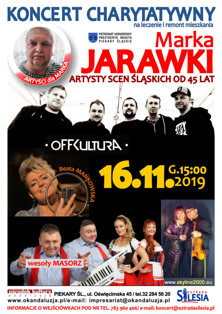 Z uwagi na problemy zdrowotne i mieszkaniowe, z którymi boryka się Marek Jarawka firma Estrada Silesia organizuje koncert “Artyści dla Marka Jarawki”. Zostanie zorganizowany jutro, 16 listopada w Ośrodku Kultury “Andaluzja” o godzinie 15:00. W trakcie jego trwania na scenie wystąpią: Beata Mańkowska, kabaret Wesoły Masorz, Off Kultura i zespół Skyline.
