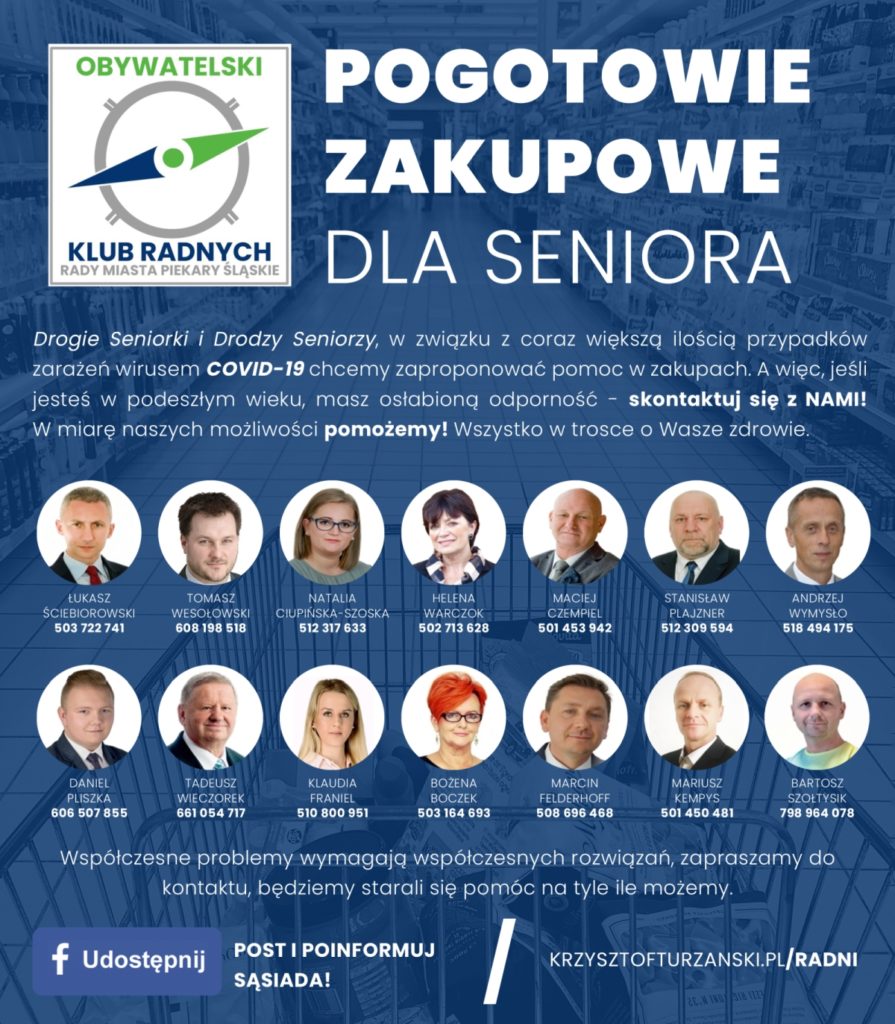 Przypominam także o akcji “Zakupy dla seniora”, którą także prowadzą radni Obywatelskiego Klubu Radnych. Macie nasze numery – jesteśmy do Waszej dyspozycji. Jeśli trzeba zrobimy dla Was zakupy. Nie tylko seniorom, ale np. samotnym matkom, które nie mają z kim zostawić dziecka. Jeśli potrzebujecie naszego wsparcie – dzwońcie. Jesteśmy dla Was.