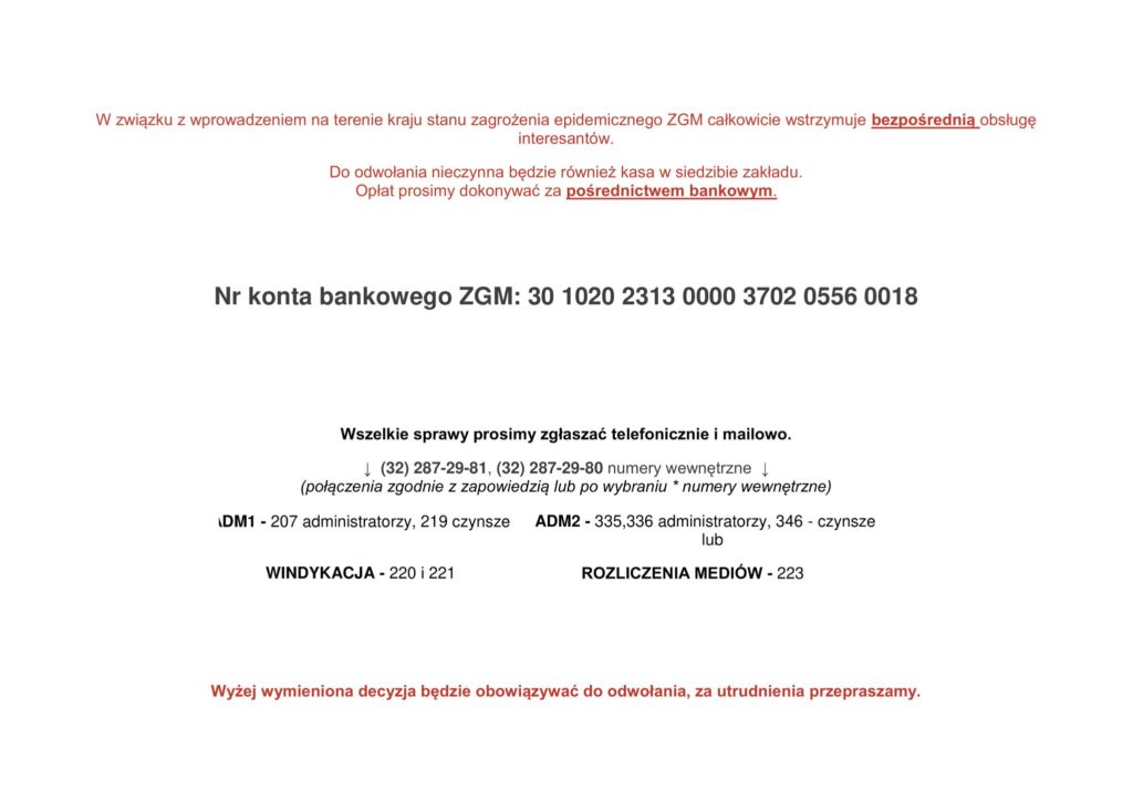 UWAGA! W ostateczności, jeśli nie będziecie mieli Państwo żadnej innej możliwości dokonania opłaty, proszę o kontakt telefoniczny z ZGM i ustalenie indywidualnego sposobu wpłaty czynszu.
