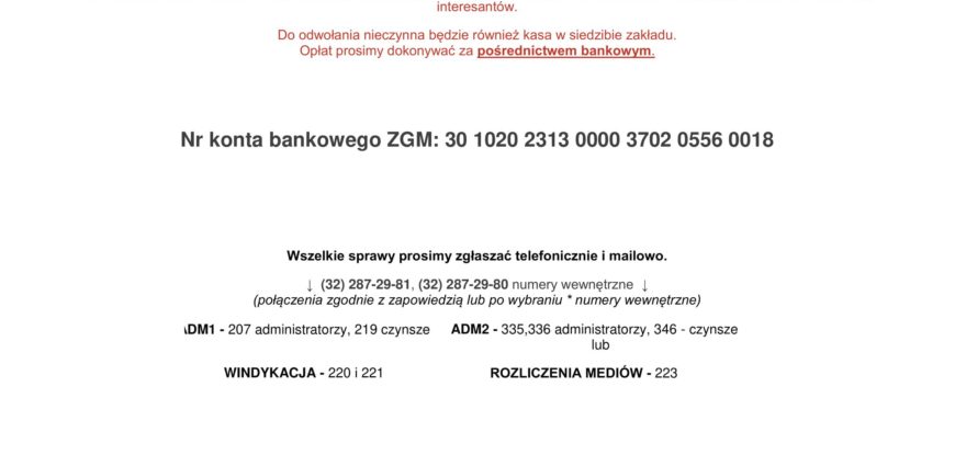 W związku z licznymi pytaniami mieszkańców w sprawie płatności czynszowych. W Waszym imieniu poprosiłem pracowników ZGM o podanie nr konta do opłat oraz nr telefonu pod który można dzwonić w razie jakichkolwiek wątpliwości.