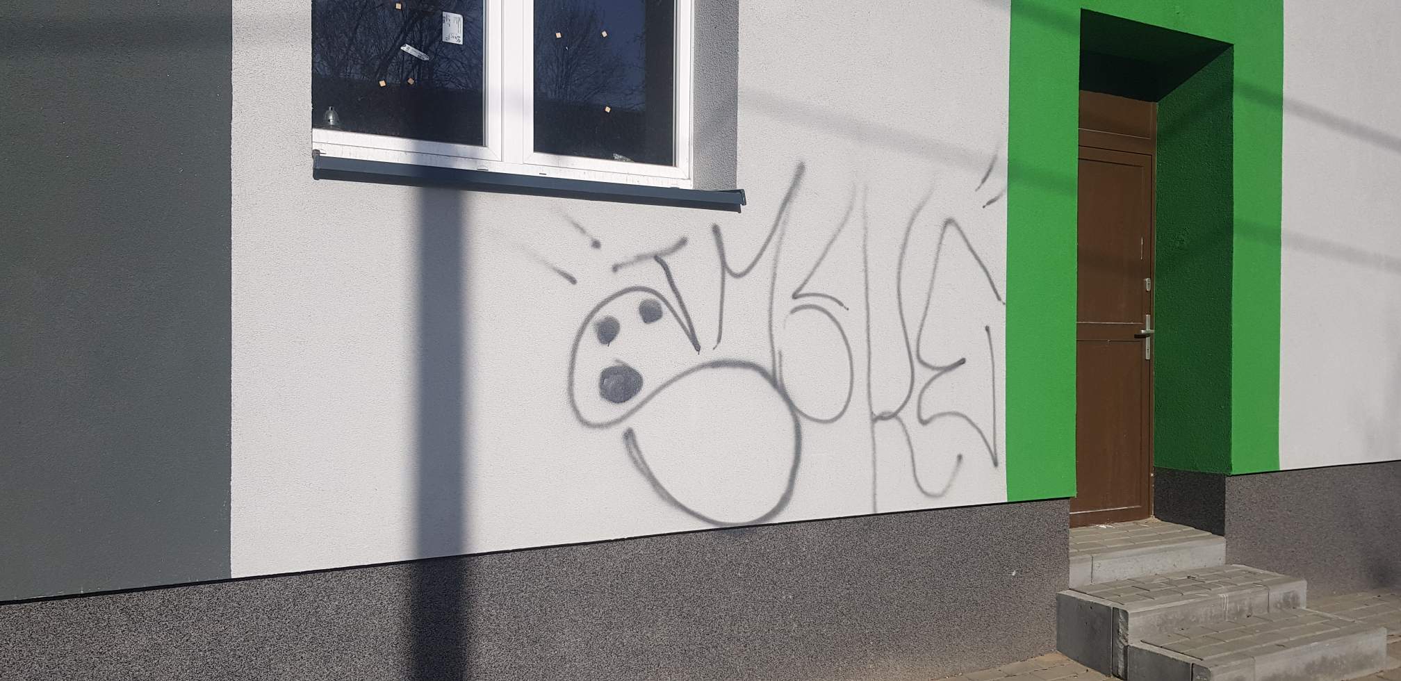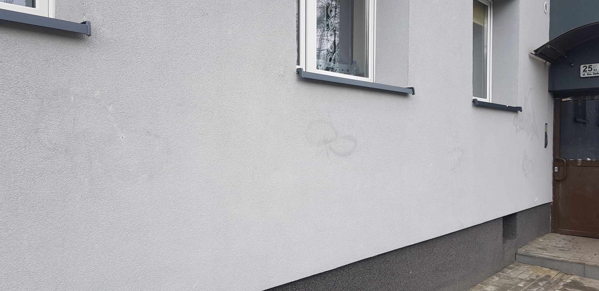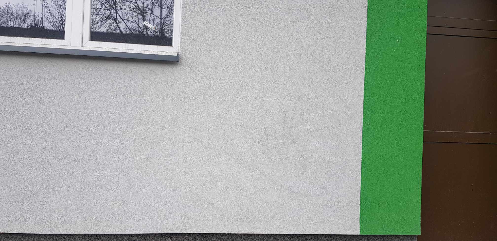 Tuż przed świętami pseudo artysta, a może lepiej nazwać to wprost chuligan, wandal i bezmyślny kretyn zniszczył elewację kolejnego budynku. Taki “prezent wielkanocny” dla mieszkańców. Pracownicy Zakładu Gospodarki Komunalnej wyczyścili elewację, niestety, ślady czarnej farby są widoczne, konieczne będzie prawdopodobnie malowanie.