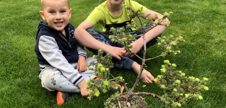 Oczywiście Maciek nie może być gorszy, więc przybyło nam drzewek, o które teraz muszą dbać. Zaczęli ambitnie od przycinania, kształtowania oraz obowiązkowego podlewania. Znalazł się też nawóz do iglaków. Teraz tylko patrzeć jak rośnie… Zobaczymy na jak długo wystarczy im entuzjazmu, bo przecież drzewo nie rośnie z dnia na dzień.