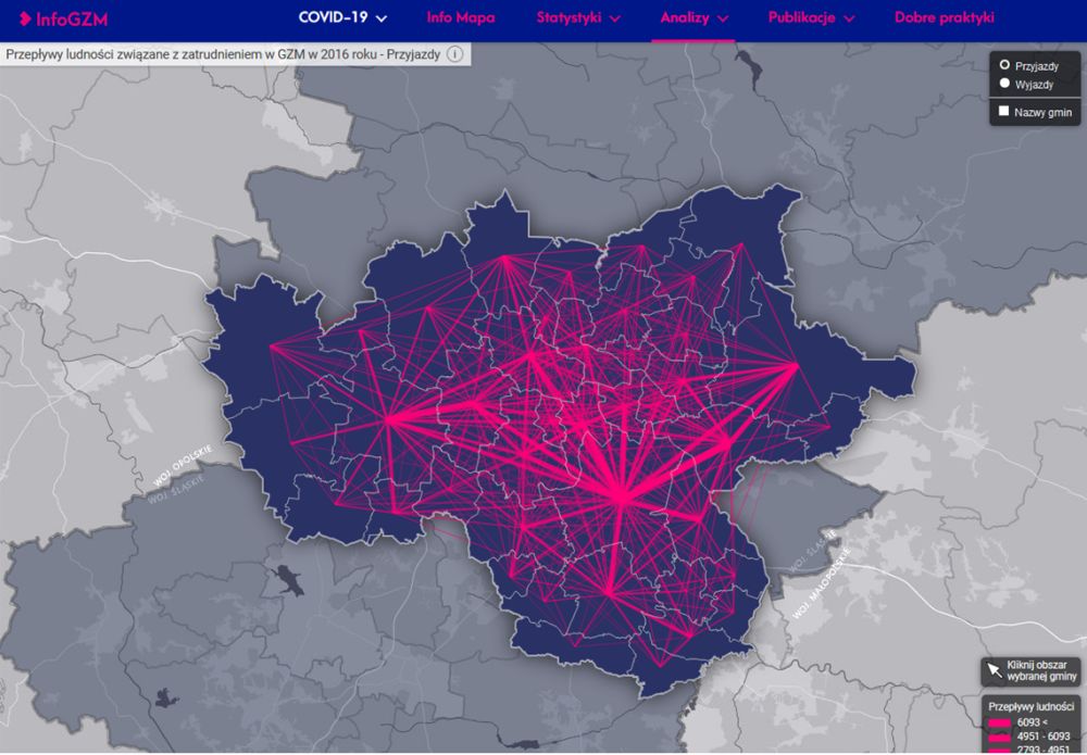 Z mapą można się zapoznać na portalu InfoGZM w zakładce Analizy > Mapy > Przepływy ludności związane z zatrudnieniem.
