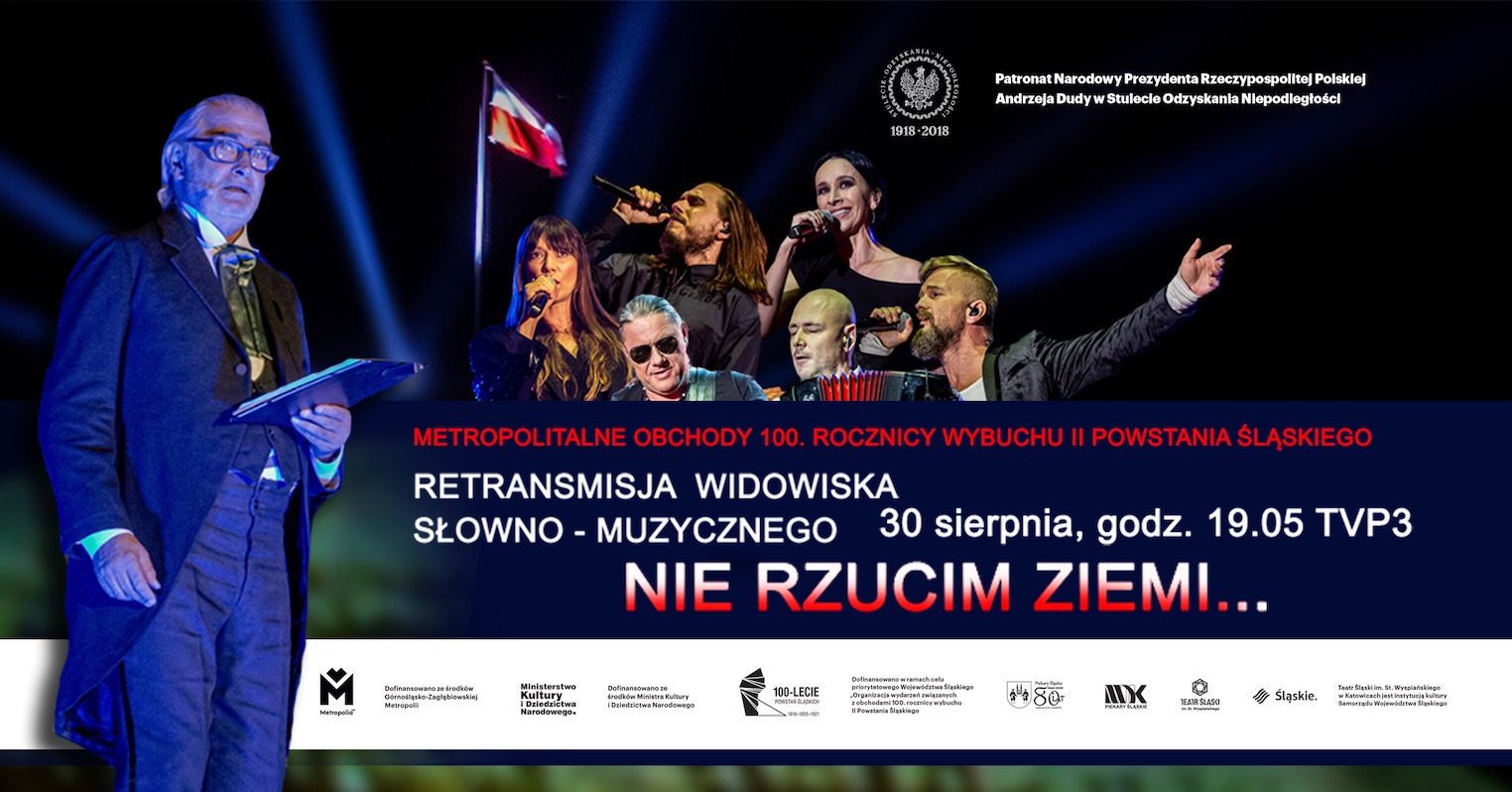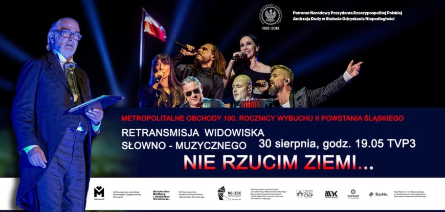 Retransmisja widowiska teatralno-muzycznego “Nie rzucim ziemi”, które odbyło się pod Kopcem Wyzwolenia w Piekarach Śląskich w ramach Metropolitalnych Obchodów 100. Rocznicy II Powstania Śląskiego na antenie TVP3 Katowice w niedzielę 30 sierpnia o godzinie 19.05. Nie możecie tego przegapić!