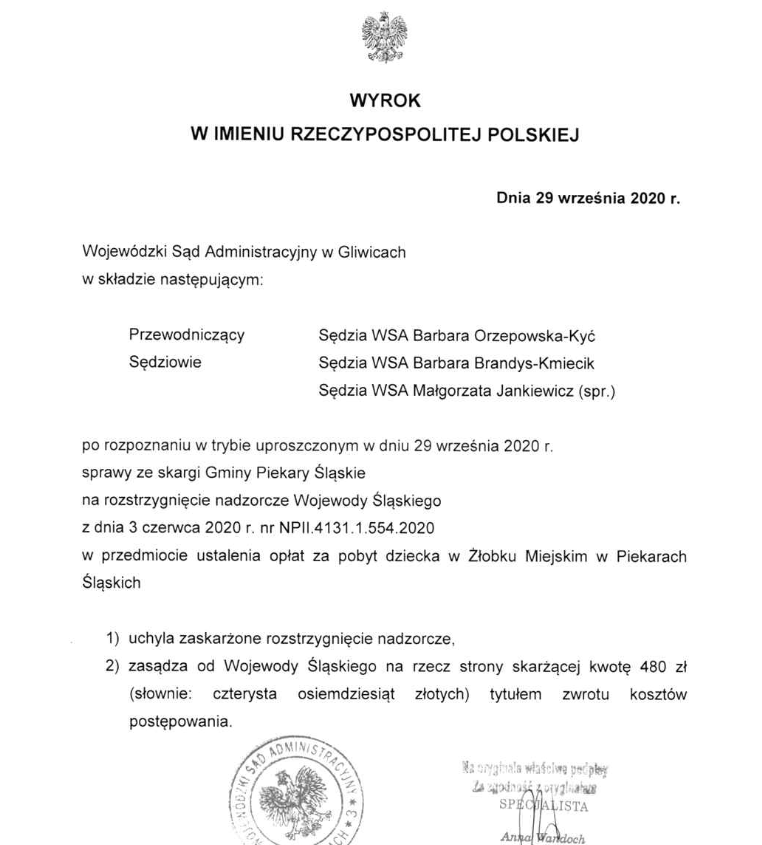 Miasto skierowało sprawę do WSA (Wojewódzkiego Sądu Administracyjnego), który nie podzielił zdania wojewody – uchylając jego rozstrzygnięcie nadzorcze i przyznając rację radnym Rady Miasta Piekary Śląskie. Zobacz wyrok WSA.