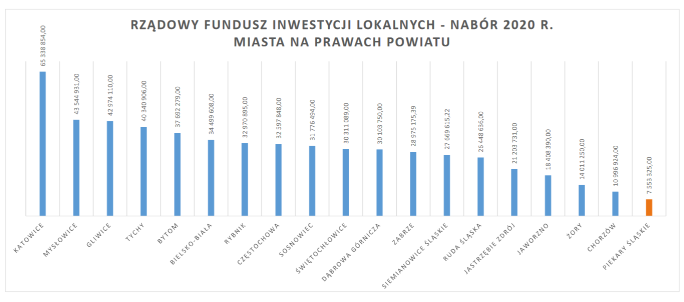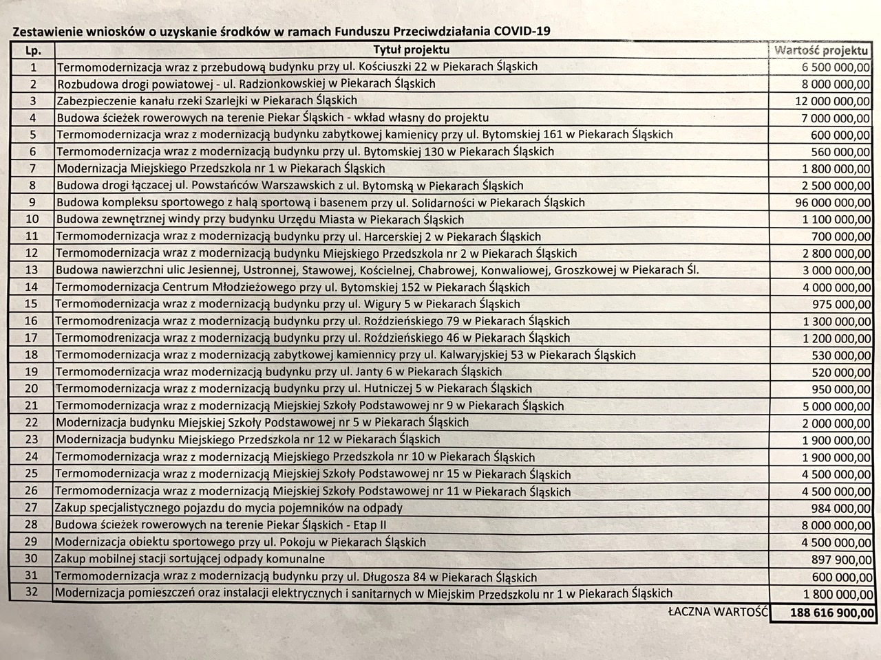 Otrzymaliśmy 600 tysięcy złotych z Rządowego Funduszu Inwestycji Lokalnych. To właściwie nic, bo pula pieniędzy do podziału wynosiła 1,2 miliarda złotych W pierwszej edycji programu Piekary Śląskie otrzymały niemal 7 mln złotych. W drugiej edycji złożyliśmy wnioski na kwotę 92 milionów na bieżące inwestycje oraz dodatkowo wniosek na 96 milionów na budowę kompleksu sportowego z basenem i halą sportową. Łączenie ponad 188 milionów.