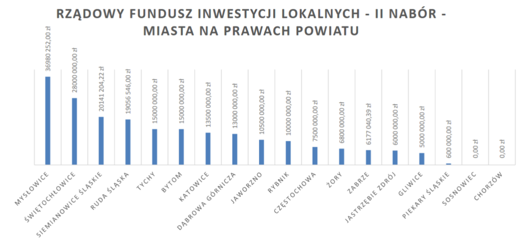Dla porównania sposób podziału środków w dwóch edycjach Rządowego Funduszu Inwestycji Lokalnych. W pierwszej brano pod uwagę prowadzone przez miasta wcześniej inwestycje i poziom wydatków majątkowych. W drugiej edycji… kryteria były nieostre, żeby nie powiedzieć, że ich nie było. Podobno brano pod uwagę kompleksowość inwestycji, ograniczenie emisyjności, uwzględnienie zasad zrównoważonego rozwoju, pomoc osobom niepełnosprawnym, czy liczbę osób, które skorzystają z inwestycji.