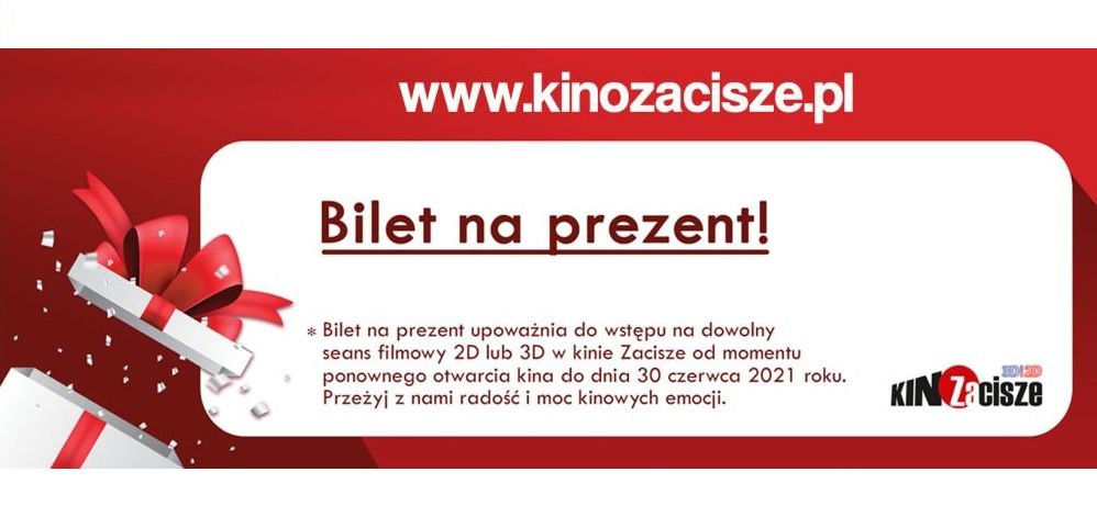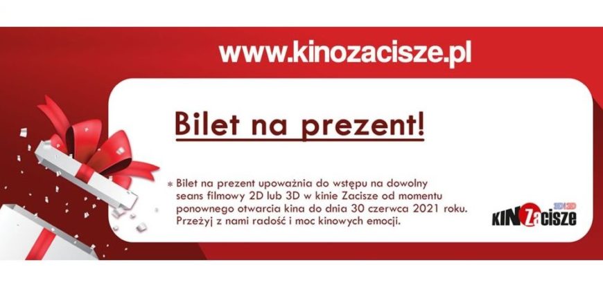 Bilety do kina pod choinką! Do 31 grudnia można nabyć specjalny Bilet na Prezent! W niezwykle atrakcyjnej cenie 13 zł możecie sobie lub najbliższym sprawić przyjemność i zafundować bilet na dowolny seans 2D i 3D, który można zrealizować od dnia otwarcia Kina Zacisze, aż do końca czerwca 2021 roku.