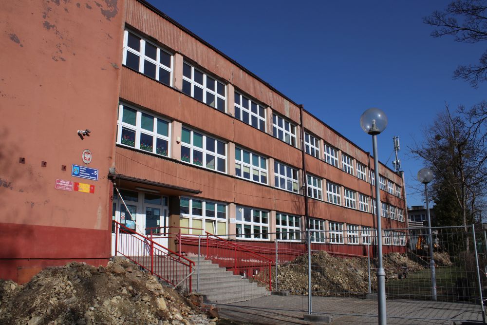 Rozpoczęła się gruntowna przebudowa Miejskiej Szkoły Podstawowa nr 5 przy ul. Chopina. Podobnie jak pozostałe wyremontowane placówki zyska nową elewację. Nie zabrakło podkreślenia, że jest to szkoła z basenem – stąd delikatna grafika na budynku. Koszt remontu to prawie 1,7 miliona złotych.