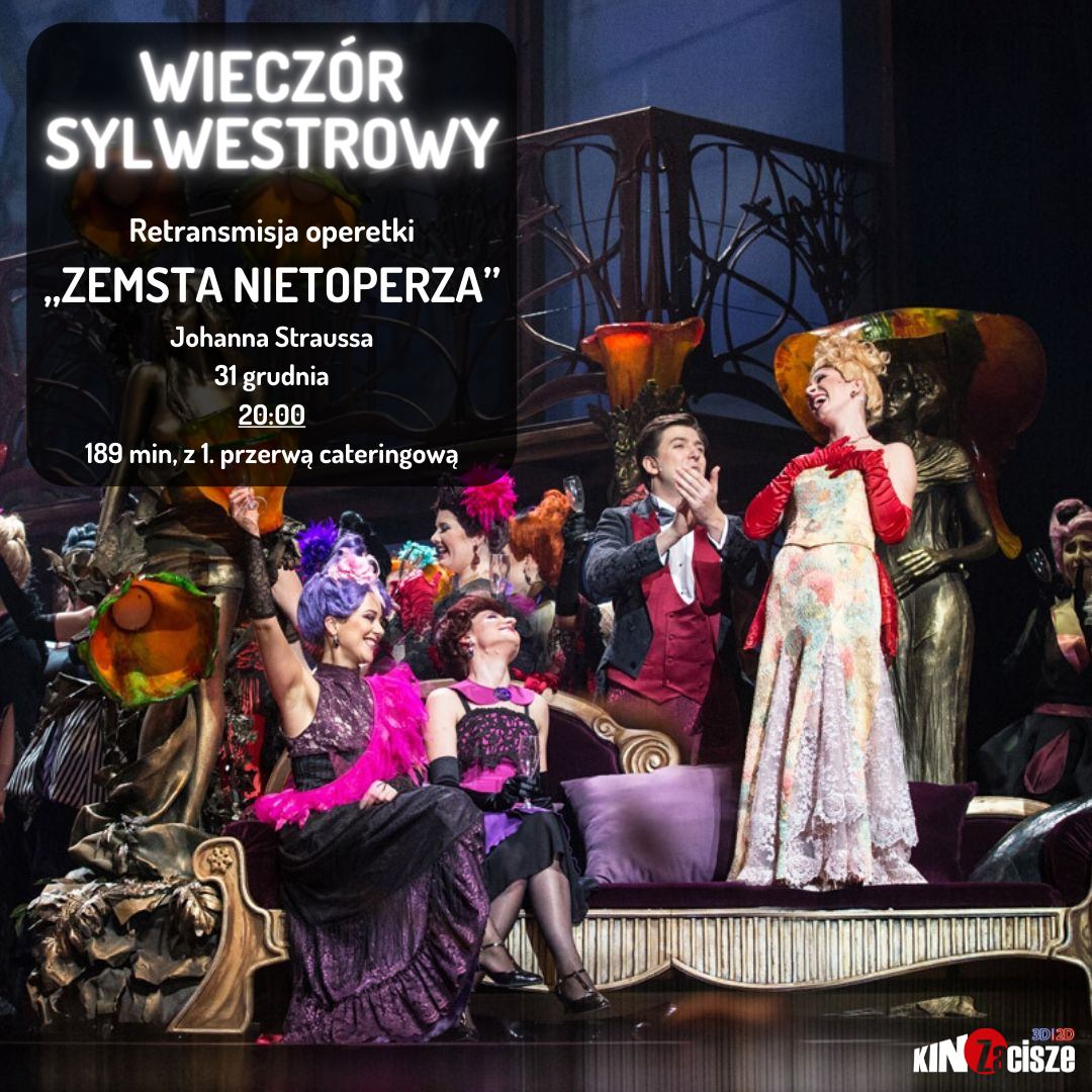 Kino Zacisze i Miejski Dom Kultury zapraszają na wyjątkowy Wieczór Sylwestrowy 31.12 od 20:00… Z retransmisją operetki Johanna Straussa (syna)… “ZEMSTA NIETOPERZA”. Przedstawienie trwa 189 minut (w tym jedna przerwa cateringowa) z uroczystym toastem o północy.