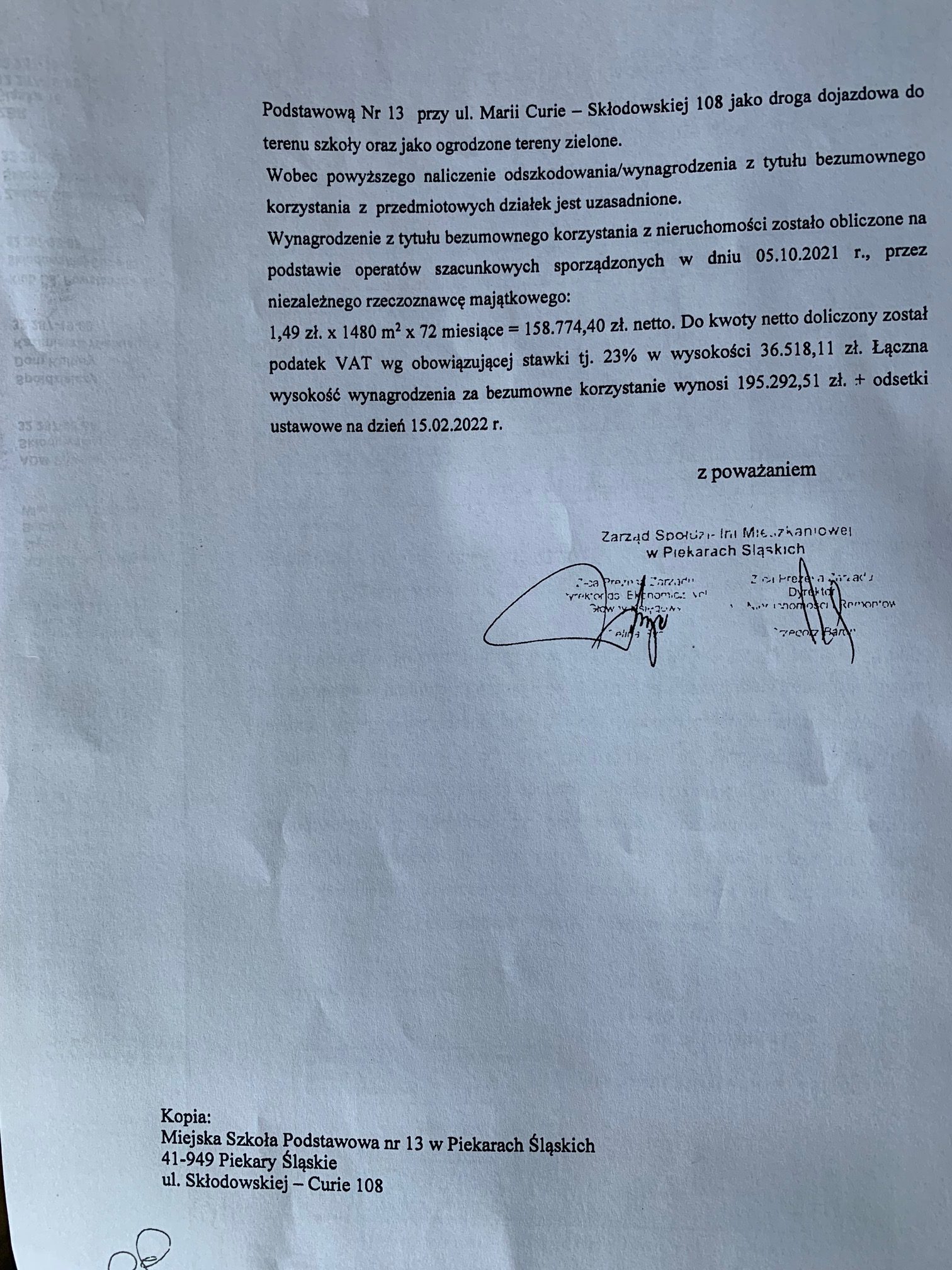 Ciekawostka to fakt, że tereny zajmowane przez szkołę to 1500 metrów kwadratowych. Wychodzi więc średnio nieco mniej niż po 5 m2 na współwłaściciela. A umówmy się – sytuacja faktyczna istnieje przynajmniej od 1988 roku, kiedy powstała szkoła. Komu służy ten teren i szkoła? Mieszkańcom Spółdzielni Mieszkaniowej. Kto zapłaciłby pieniądze, których oczekuje zarząd SM? Pośrednio spółdzielcy i wszyscy pozostali mieszkańcy Piekar Śląskich. Na co zostałyby przeznaczone? Tego już nie wiem. Ale na pewno komuś kto taki pomysł na zysk wymyślił należałaby się… premia. Moim zdaniem wysłanie takiego wezwania to po prostu WSTYD.