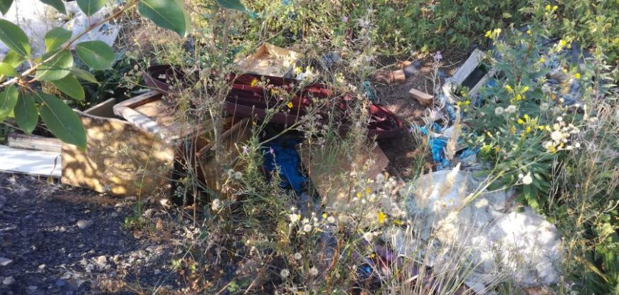 Opony, stare drzwi i elementy mebli na terenie łąki kwietnej naprzeciw ul. Szmaragdowej 21.
