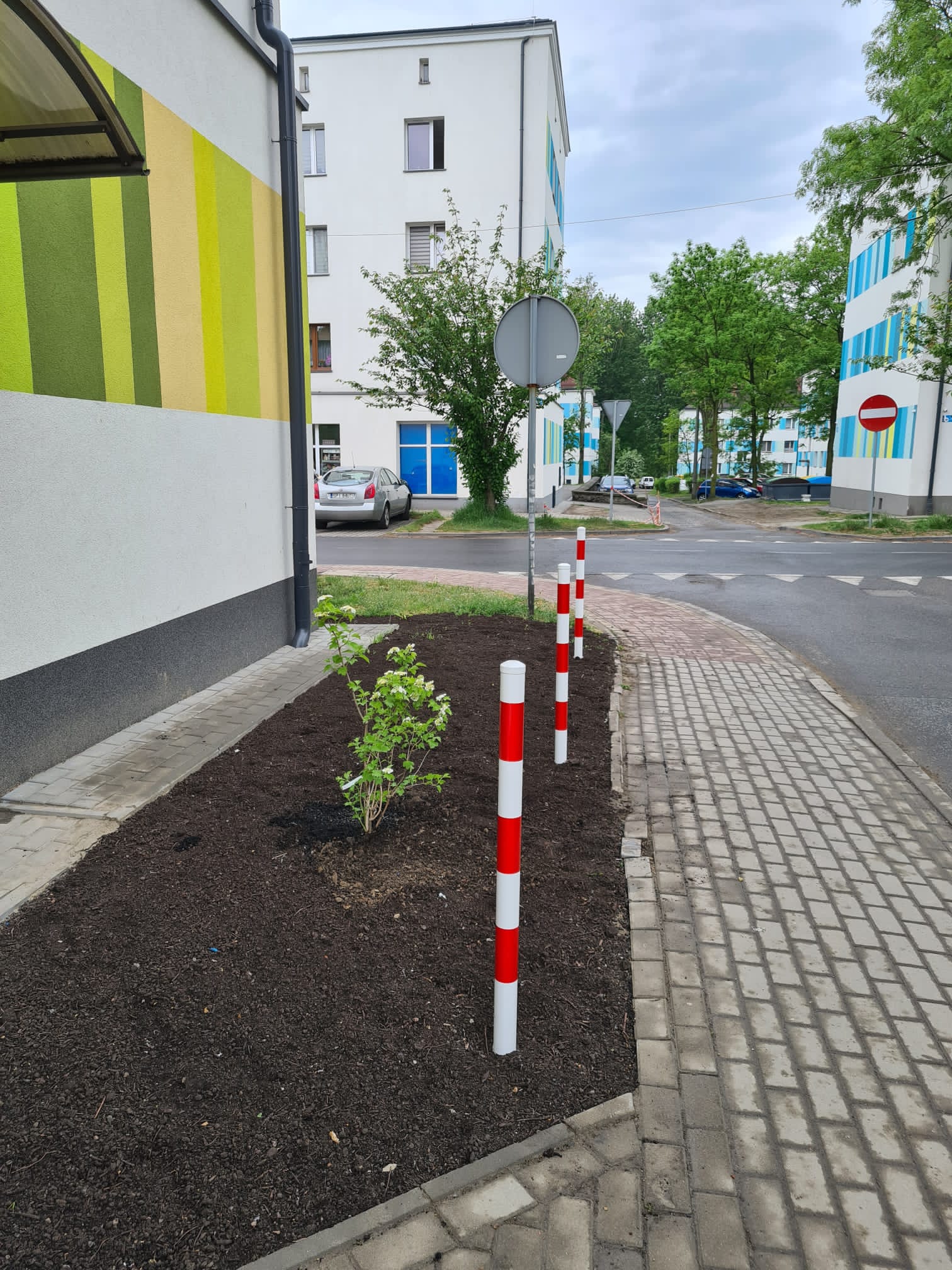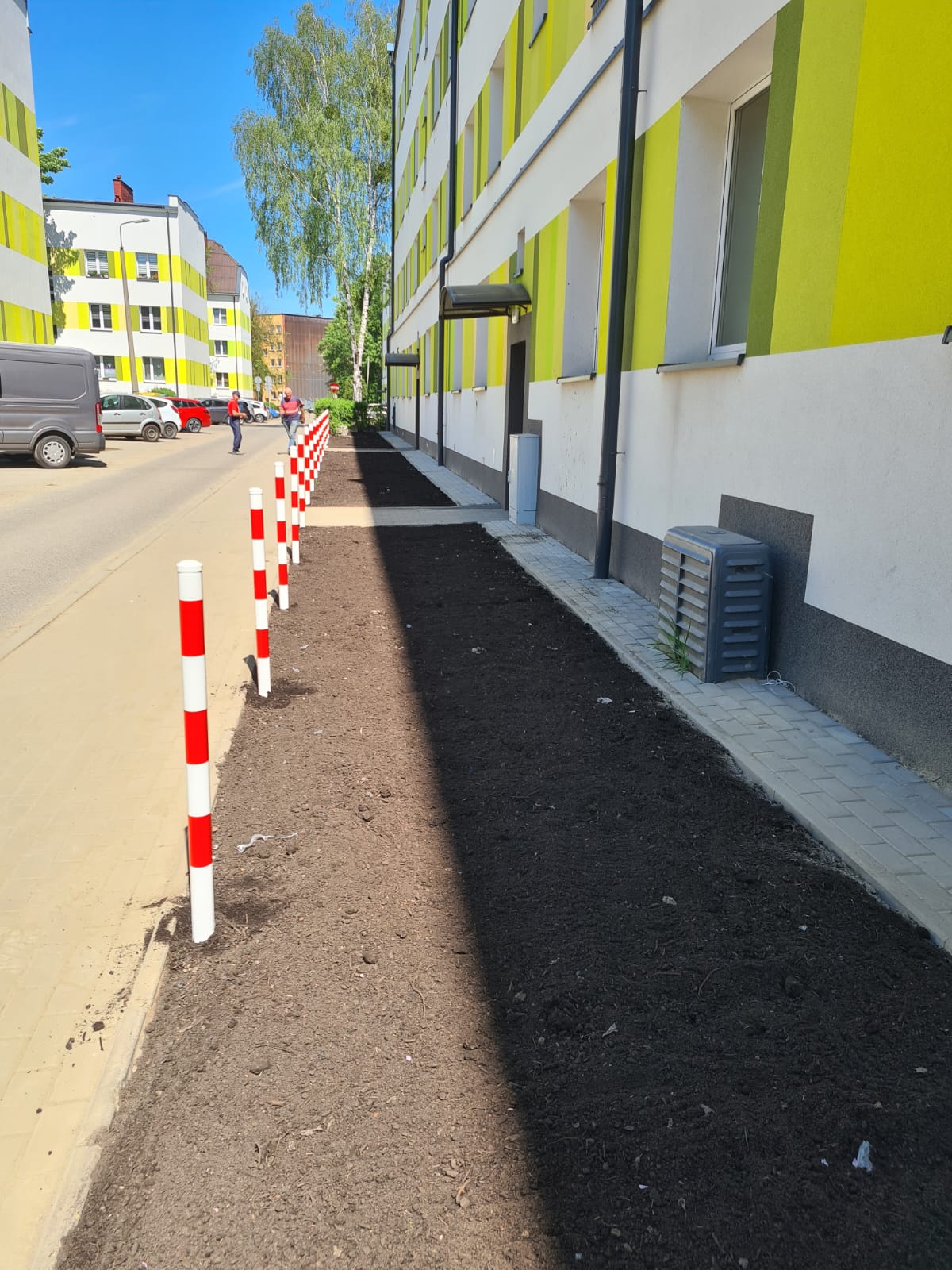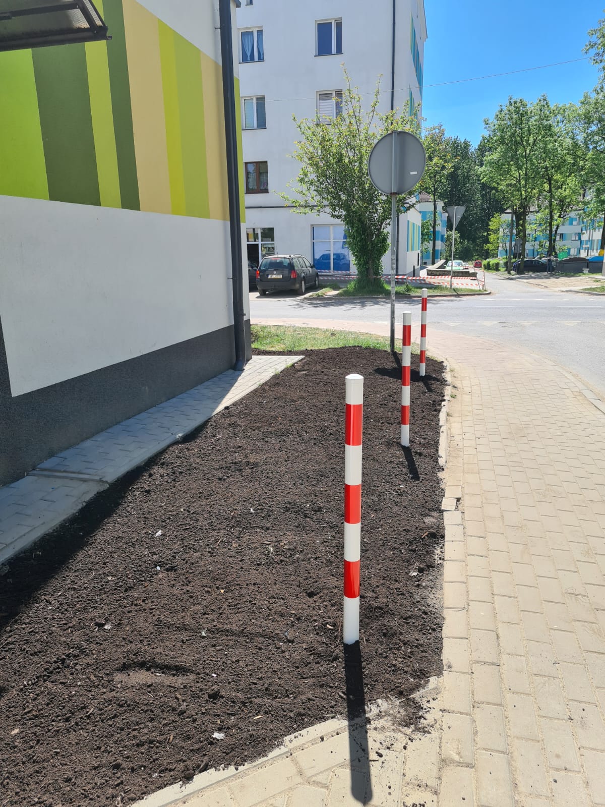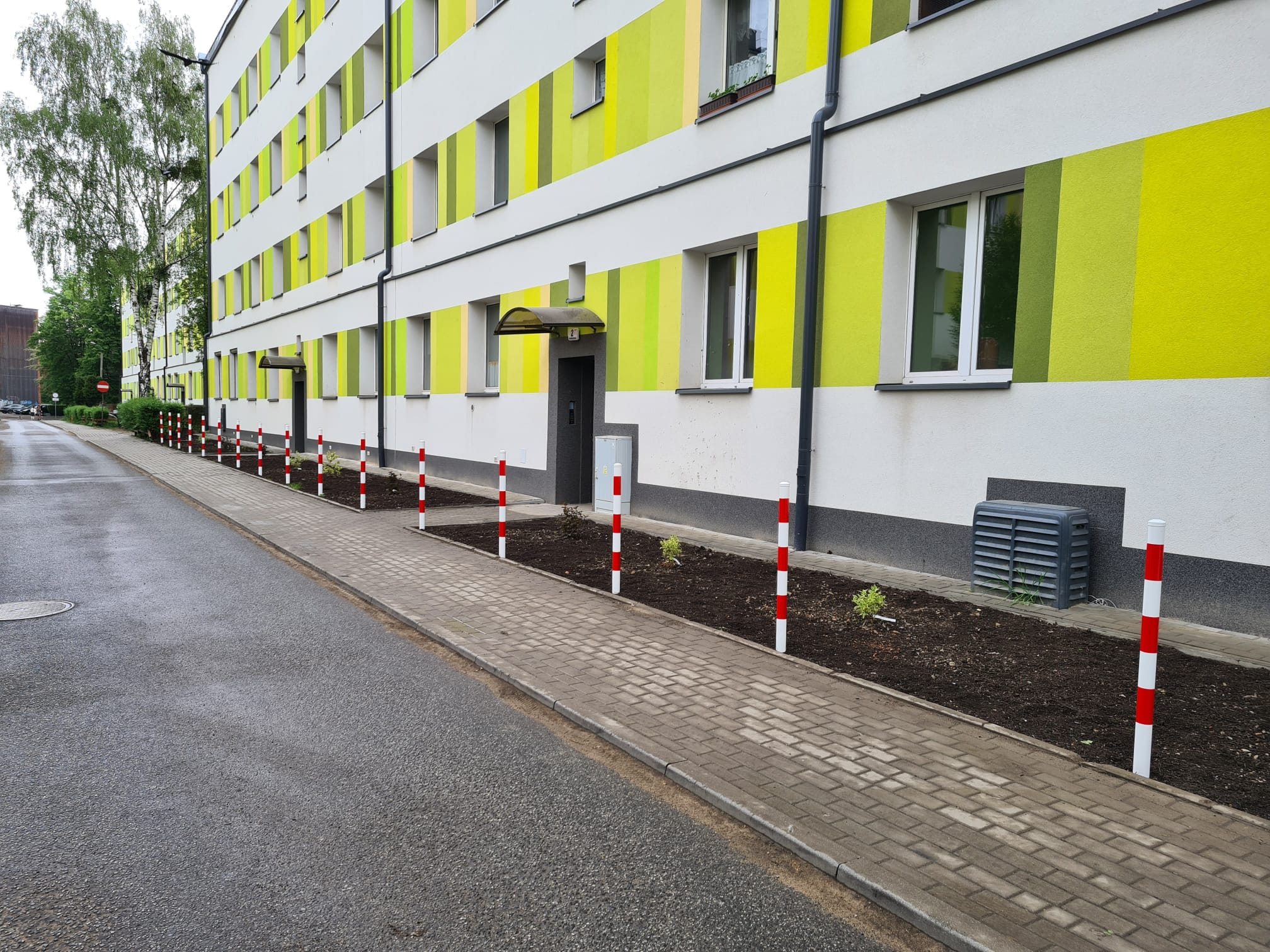 Powstają kolejne ogródki przydomowe zabezpieczone fizycznie przed rozjeżdżaniem przez samochody. Zapewni to wzrost bezpieczeństwa pod klatką schodową, da minimum przestrzeni zieleni buforowej między blokiem a ulicą oraz poprawi estetykę.