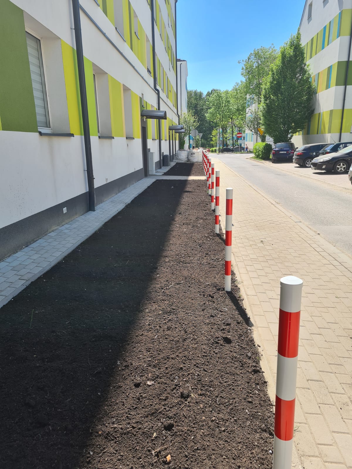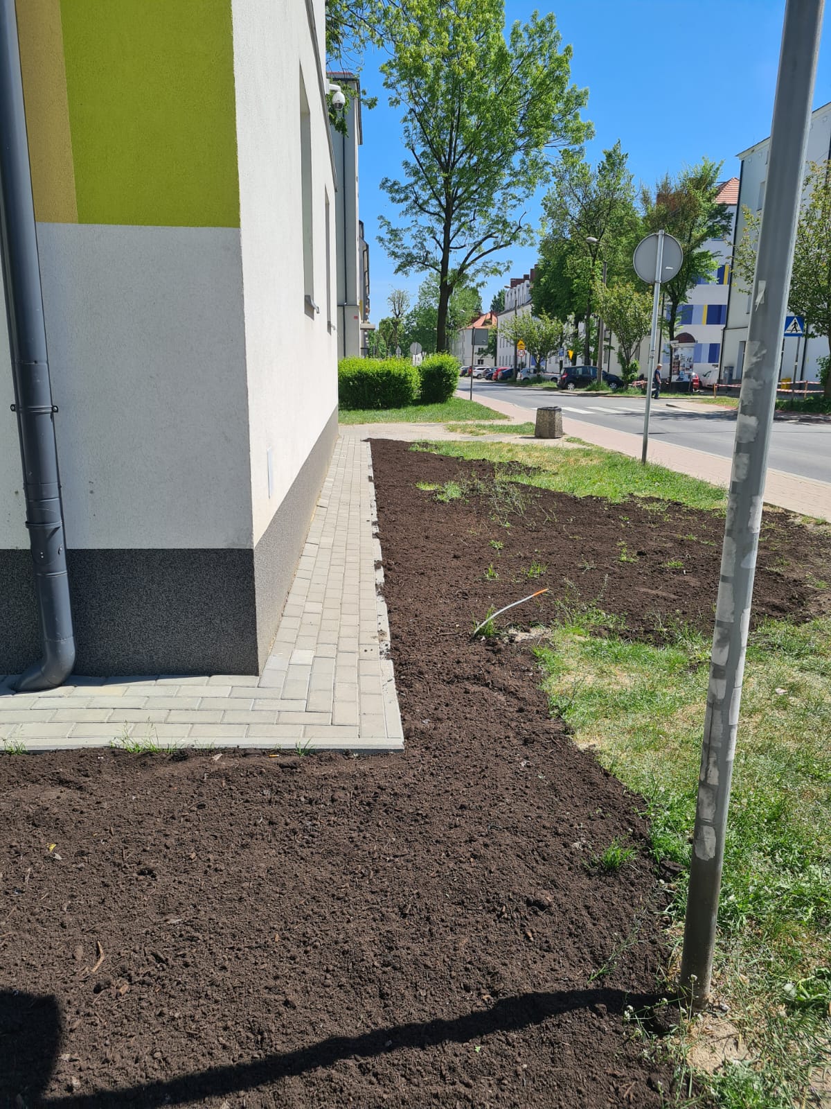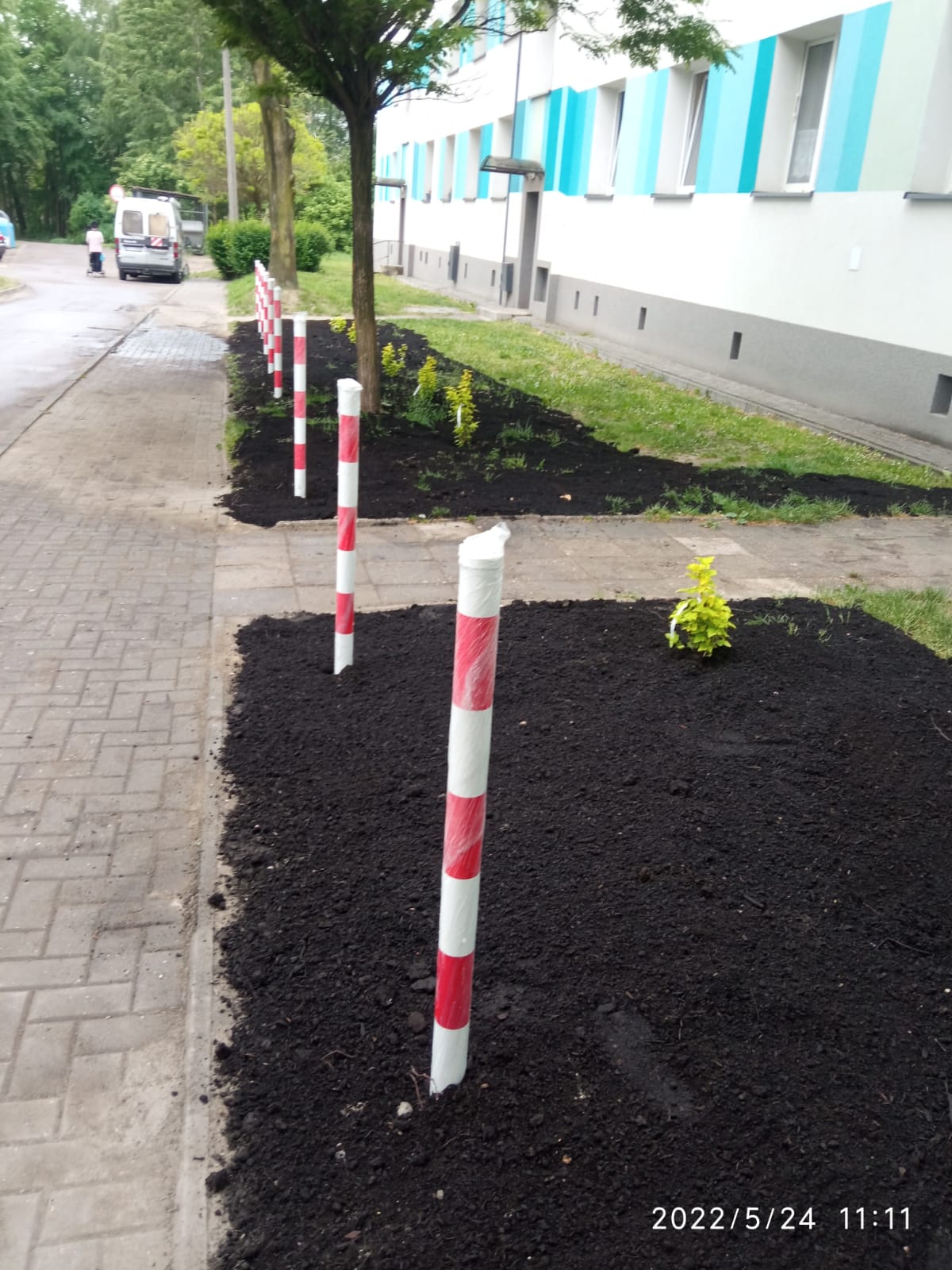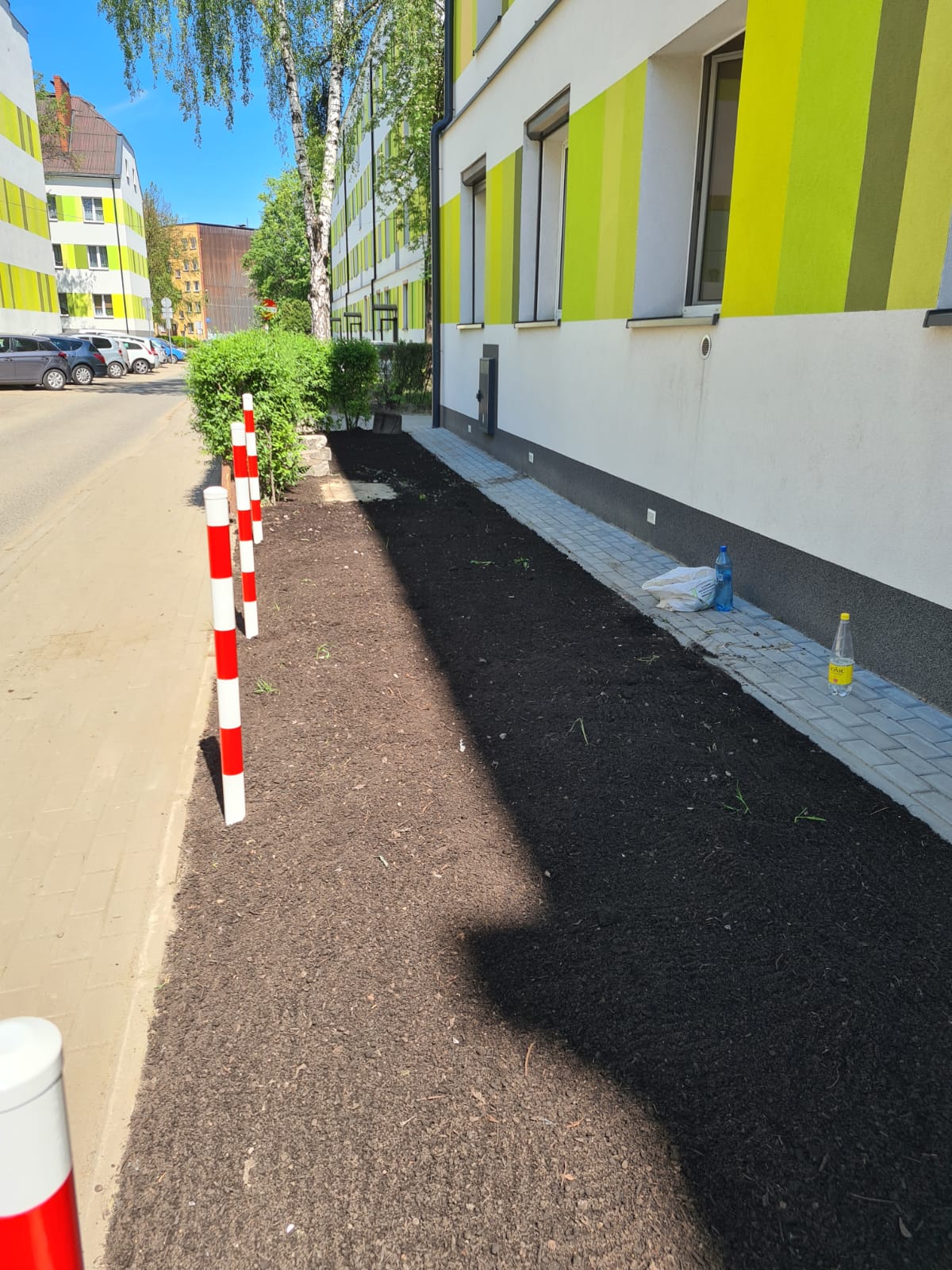 Powstają kolejne ogródki przydomowe zabezpieczone fizycznie przed rozjeżdżaniem przez samochody. Zapewni to wzrost bezpieczeństwa pod klatką schodową, da minimum przestrzeni zieleni buforowej między blokiem a ulicą oraz poprawi estetykę.