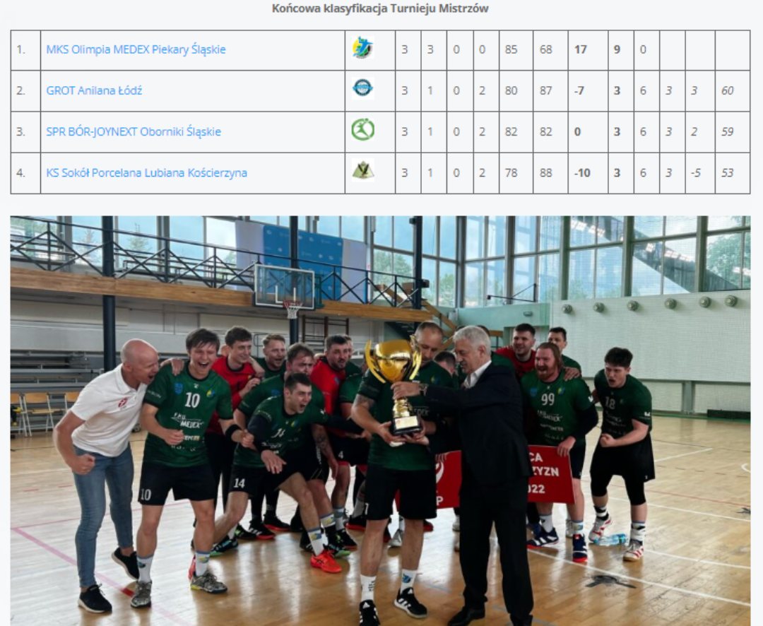 Turniej Mistrzów miał wyłonić drużyny, które awansują do Ligi Centralnej piłki ręcznej. W grze oprócz naszej Olimpii znalazły się też: KS Sokół Porcelana Lubiana Kościerzyna, SPR BÓR-JOYNEXT Oborniki Śląskie i GROT Anilana Łódź. Wszystko działo się w dniach 27 – 29 maja w Warszawie.Chłopaki nie sprawili kibicom zawodu. Z KS Sokół rozprawili się 30:25, później pokonali SPR Bór -Joynext 25:23, a na koniec rozgromili Grot Anilanę 30:20.