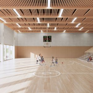Hala Sportowa jest trzecim etapem inwestycji wraz parkingiem podziemnym. Hala ma posiadać wielofunkcyjne boisko sportowe umożliwiające rozgrywanie meczów koszykówki, siatkówki i piłki ręcznej wraz z trybuną na około 850 miejsc siedzących. Budynek ten będzie podzielony na strefę sportową boiska od strony ul. Solidarności oraz na strefę obsługującą kibiców od strony północnej z głównym wejściem oraz wizualnym otwarciem na zielony plac. W holu głównym znajdzie się recepcja, szatnie oraz komunikacja pionowa w postaci schodów i wind. Wykorzystując wysokość hali na drugim piętrze znajdą się pomieszczenia administracyjne oraz sala konferencyjna, a także pomieszczenia techniczne. Pierwsze 5 rzędów trybuny projektowane jest jako trybuna składana, co umożliwia powiększenie w zależności od potrzeb płyty boiska i stworzenie np. dwóch boisk treningowych. Na kondygnacji podziemnej znajdzie się strzelnica sportowa dostępna z holu głównego, lub z zewnątrz poprzez klatkę schodową i przez garaż. Garaż pomieści 60 samochodów.