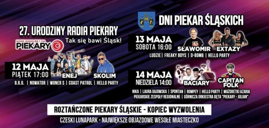 Największa impreza Piekar Śląskich – Dni miasta i 27. urodziny Radia Piekary. Weekend 12-14 maja w Piekarach Śląskich zapowiada się wyjątkowo rozrywkowo, pod Kopcem Wyzwolenia zagrają: Enej, Sławomir i Baciary, ale też wielu wielu innych wykonawców. Będzie się działo – nie może Was zabraknąć!