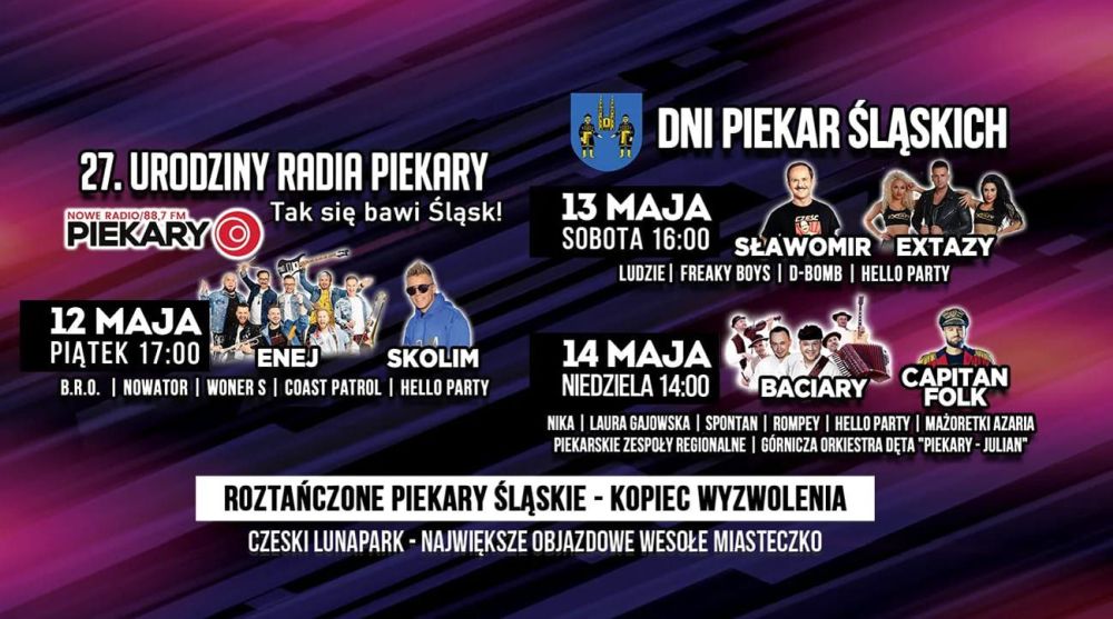 Największa impreza Piekar Śląskich – Dni miasta i 27. urodziny Radia Piekary. Weekend 12-14 maja w Piekarach Śląskich zapowiada się wyjątkowo rozrywkowo, pod Kopcem Wyzwolenia zagrają: Enej, Sławomir i Baciary, ale też wielu wielu innych wykonawców. Będzie się działo – nie może Was zabraknąć!