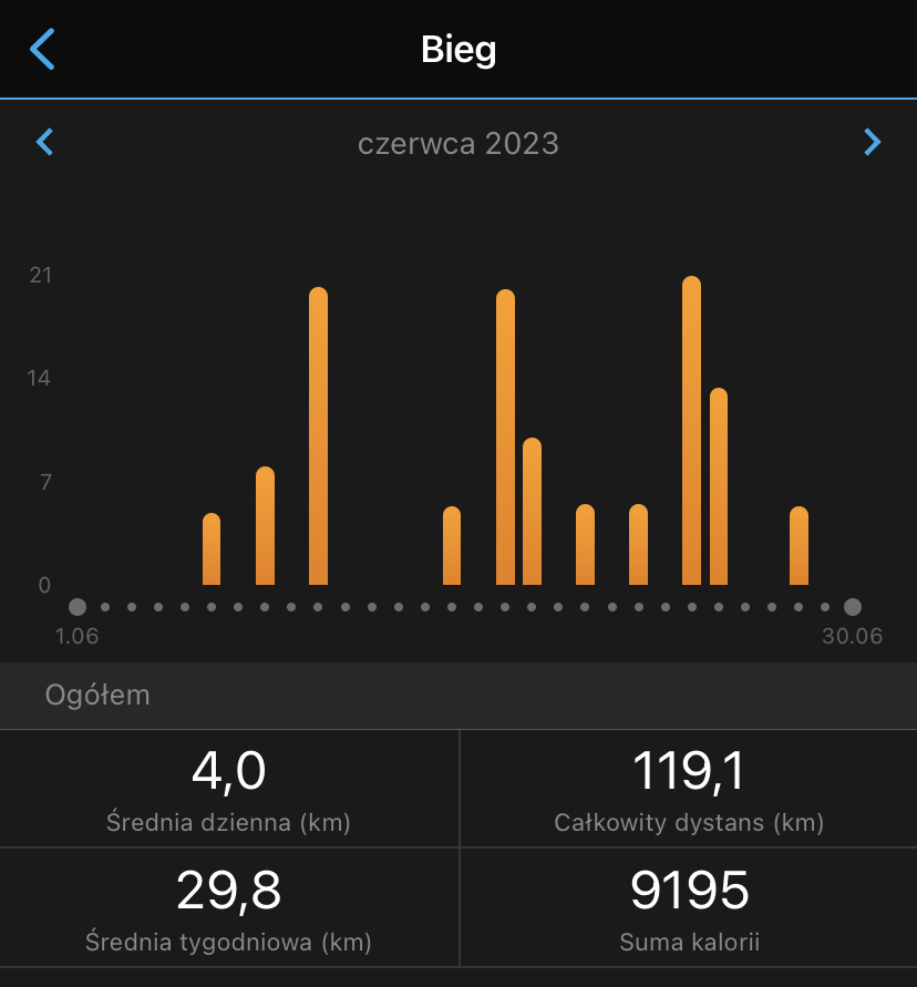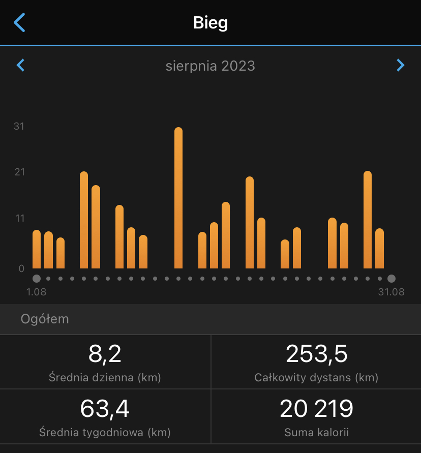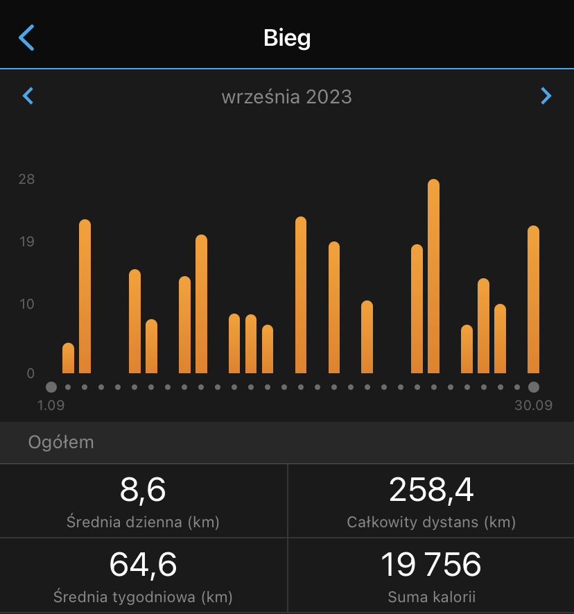 Przebiegłem jakąś “kosmiczną” dla mnie ilość kilometrów. Jak to wszystko wytrzymałem nie wiem. Teraz zmniejszam kilometraż, trochę łapię oddechu i 22 października zmierzę się z dystansem 42 km i przede wszystkim ze swoimi słabościami.