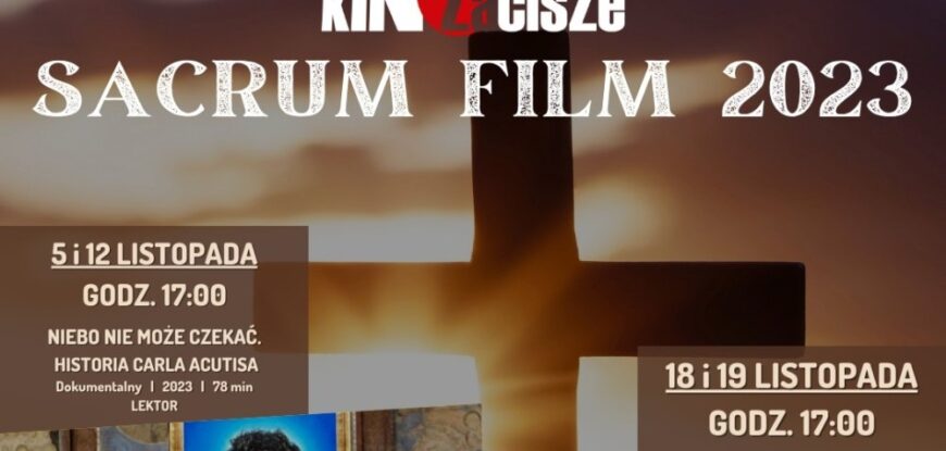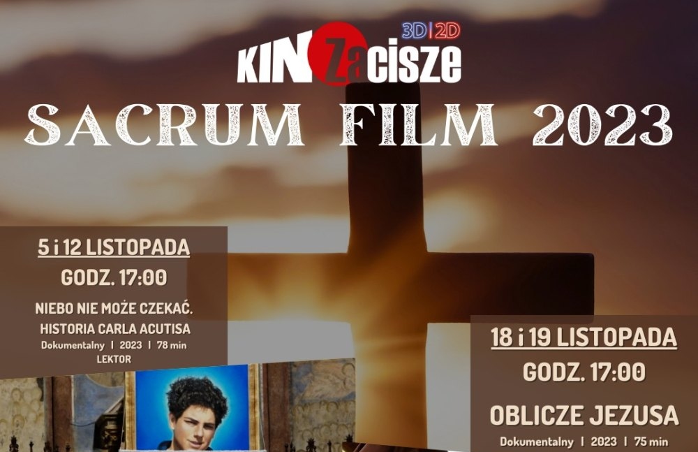 W piekarskim Kinie Zacisze w ramach wydarzenia Sacrum Film 2023 odbędą się pokazy filmów dokumentalnych o tematyce religijnej. Pierwszy z nich pt.: “Niebo nie może czekać. Historia Carla Acutisa” już 5 listopada o godzinie 17:00. Kolejny seans 12 listopada o godz. 17:00. Następnie, 18 i 19 listopada o godz. 17:00 zostanie wyświetlony film pt.: “Oblicze Jezusa”.