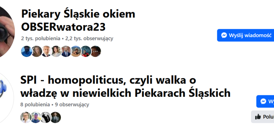 Ostatnio pojawił się nowy profil SPI – homopoliticus, czyli walka o władzę w niewielkich Piekarach Śląskich, który zapowiada analizę samorządu piekarskiego, ale na ten moment obiektywność i podejście trudno oceniać, bo tekstów dotyczących bieżących wydarzeń brak. Jest na razie analiza, raczej chłodna – sytuacji samorządowej.