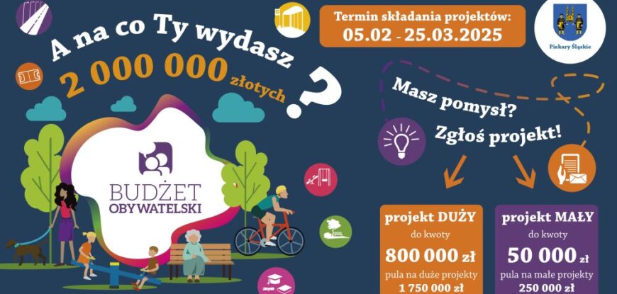 Czekamy na zgłoszenia do 12. edycja piekarskiego Budżetu Obywatelskiego. Wnioski z pomysłami można składać do 25 marca 2025. Łącznie do dyspozycji będziecie mieli 2.000.000 zł. Nadal obowiązuje podział na duże i małe projekty. Głosowanie ruszy pod koniec maja 2025 r. Razem zmieniamy Piekary!