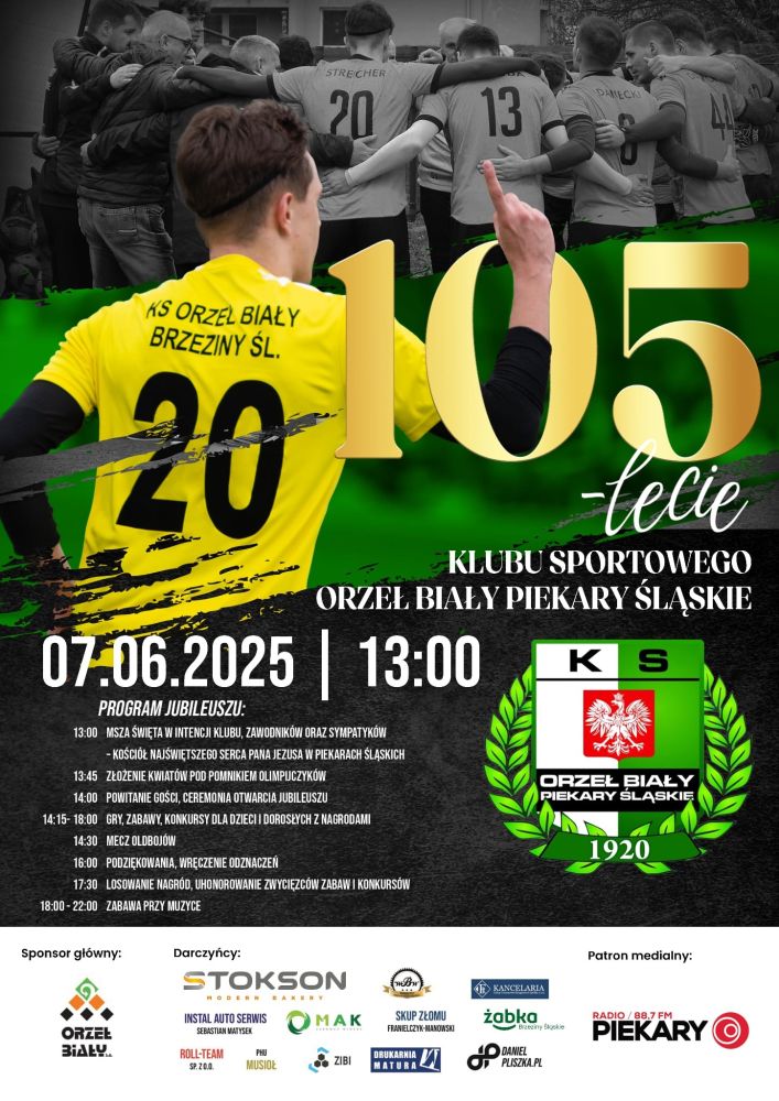 Klub Sportowy Orzeł Biały to prawdziwa duma i tradycja Piekar Śląskich, naznaczony licznymi ciężkimi wydarzeniami odradzał się z popiołów niczym feniks, a teraz zaprasza mieszkańców, nie tylko Brzezin Śląskich na swój jubileusz 105-lecia. 7 czerwca od godziny 13.00 szykuje się rodzinny festyn pełen atrakcji dla dużych i małych. Będzie to niezwykły moment w historii naszej społeczności, który chcemy uczcić razem z Wami. Odbędzie się mecz towarzyski pomiędzy oldbojami KS Orzeł Biały, a DKS Czarni Kozłowa Góra.