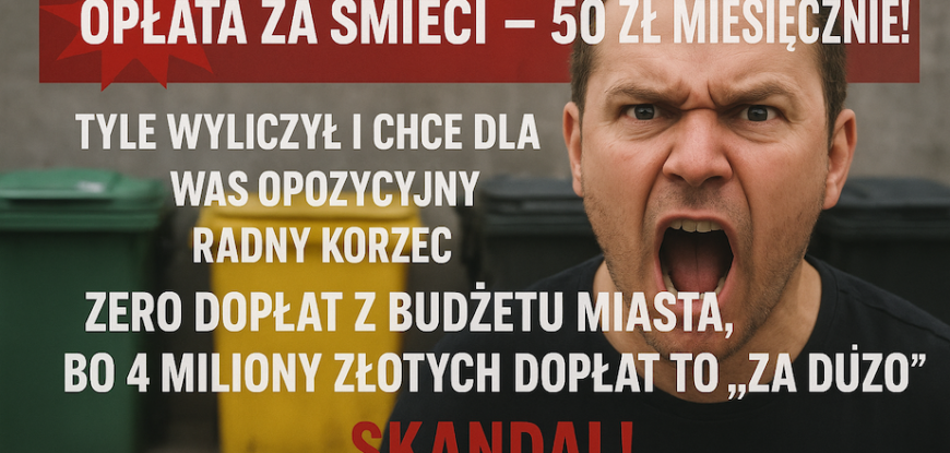 Opozycja mówi: SKANDAL! „Apelowaliśmy, że pieniądze z opłaty śmieciowej się skończą”. „Wyciągnięte 4 miliony z budżetu to dużo”. Czyli w skrócie: nie dopłacać z budżetu miasta do odbioru śmieci. Mówiąc wprost — opozycja namawia, żeby podnieść Państwu opłaty za śmieci. Nawet do 50 złotych miesięcznie – jak wylicza radny Korzec.